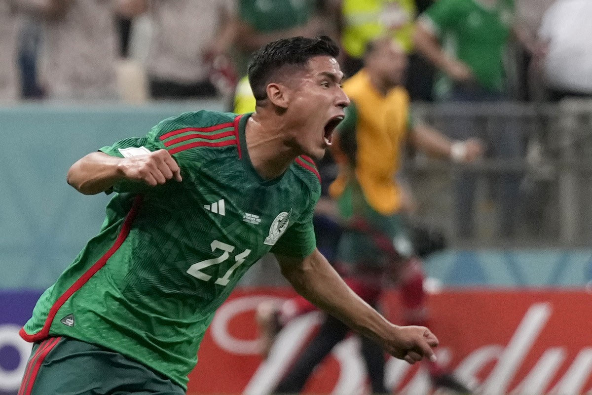 Mexico's Henry Martin, Edson Alvarez and Uriel Antuna, from left, run with the ball after scoring their second goal during the World Cup group C soccer match between Saudi Arabia and Mexico, at the Lusail Stadium in Lusail, Qatar, Wednesday, Nov. 30, 2022. (AP Photo/Ricardo Mazalan)