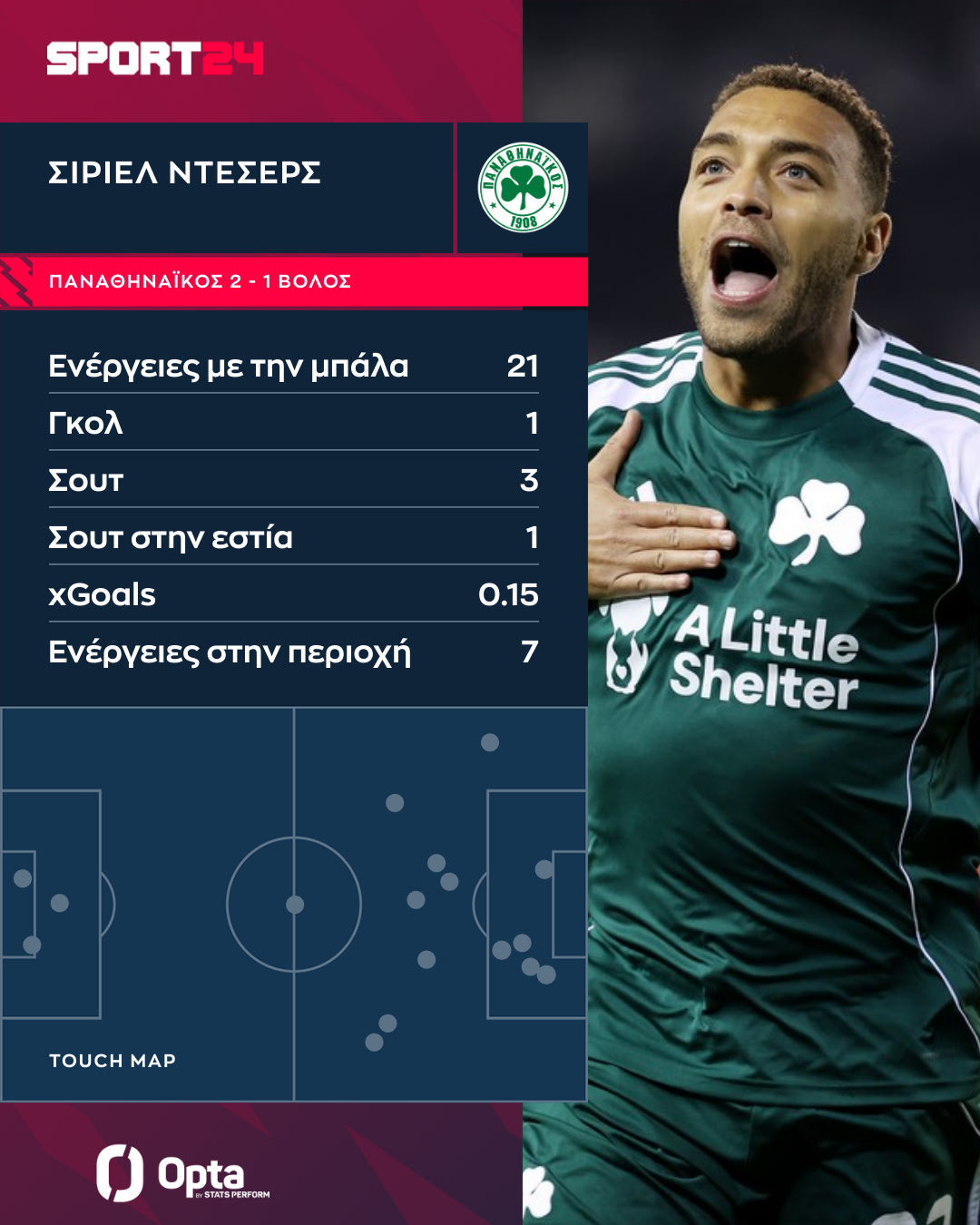 Ο Σίριελ Ντέσερς δεν χρειάστηκε παρά ελάχιστο χρόνο συμμετοχής για να καθορίσει την αναμέτρηση του Παναθηναϊκού κόντρα στον Βόλο, καθώς, αγωνιζόμενος 70 λεπτά μετέτρεψε κάθε ουσιαστική επαφή του με την μπάλα σε απειλή, επιβεβαιώνοντας μέσα από τους αριθμούς και την εικόνα του, τον λόγο που μπορεί να αποτελέσει το σημείο αναφοράς της επίθεσης των πρασίνων.
