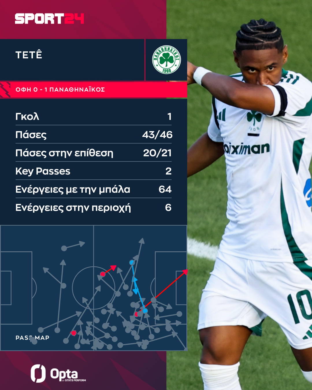 Στο γράφημα της Opta/Stats Perform μπορείτε να δείτε τις μεταβιβάσεις του Τετέ, αλλά και τις κορυφαίες του επιδόσεις στο παιχνίδι απέναντι στον ΟΦΗ.