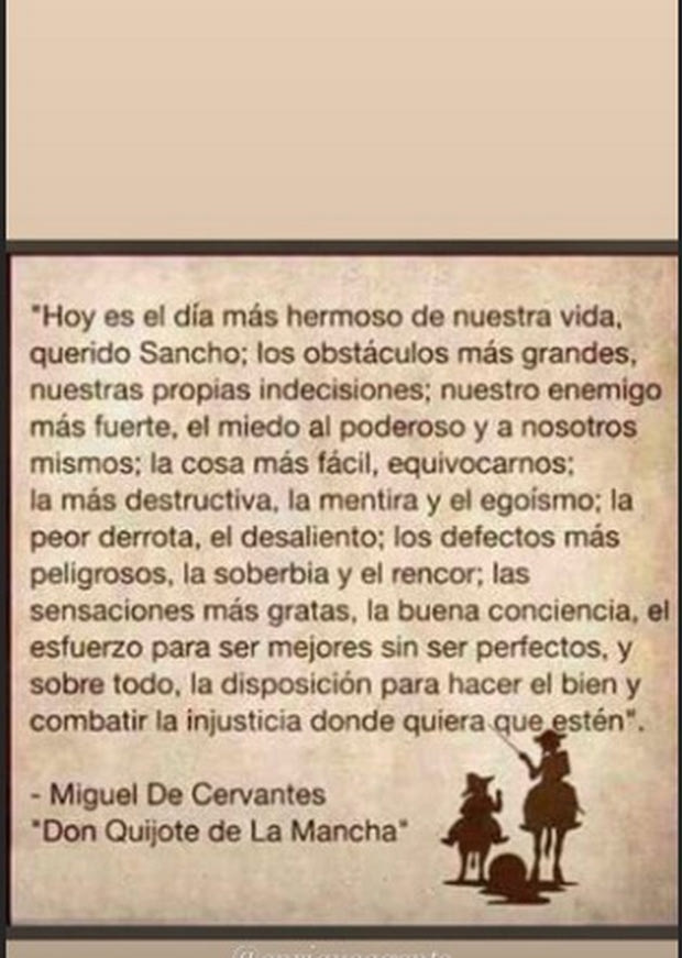 “Σήμερα είναι η πιο όμορφη μέρα της ζωής μας, αγαπητέ Σάντσο. Τα μεγαλύτερα εμπόδια, είναι οι δικές μας αναποφάσιστες στιγμές. Ο ισχυρότερος εχθρός μας, ο φόβος του ισχυρού και ο εαυτός μας. Το πιο εύκολο πράγμα, είναι να κάνεις λάθη. το πιο καταστροφικό, είναι τα ψέματα και ο εγωισμός. Η χειρότερη ήττα, είναι η αποθάρρυνση. Τα πιο επικίνδυνα ελαττώματα, είναι η υπερβολική υπερηφάνεια και η οργή. Τα πιο ευχάριστα συναισθήματα, είναι να αισθάνεσαι καλά με τη συνείδησή σου, η προσπάθεια να γίνεσαι καλύτερος χωρίς να είσαι τέλειος και πάνω απ όλα, η διάθεση να κάνεις το καλό και να καταπολεμάς την αδικία όπου κι αν βρίσκεται…”, έγραφε το μήνυμα που ανέβασε ο Ισπανός μπακ. Αν μη τι άλλο πολύ “διαφορετικό” σε σχέση με τα κοινότυπα “αντίο” που είχαμε συνηθίσει.