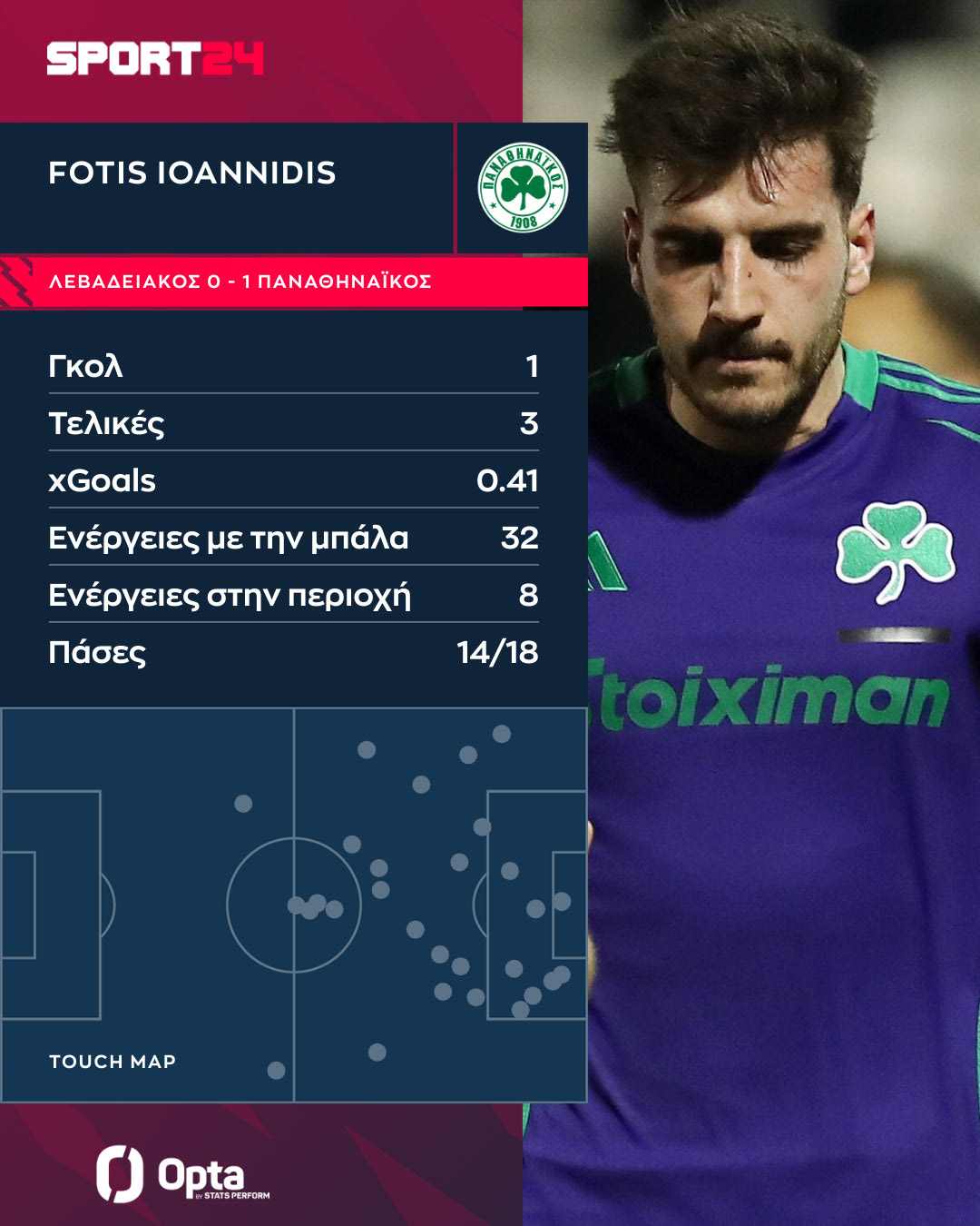 Ο φορ του Παναθηναϊκού είχε τρεις τελικές με συνολική αξία 0.41xG και ήταν ο πιο απειλητικός ποδοσφαιριστής των πρασίνων. Ο Ιωαννίδης είχε 32 ενέργειες με την μπάλα, μέσα και έξω από την περιοχή.