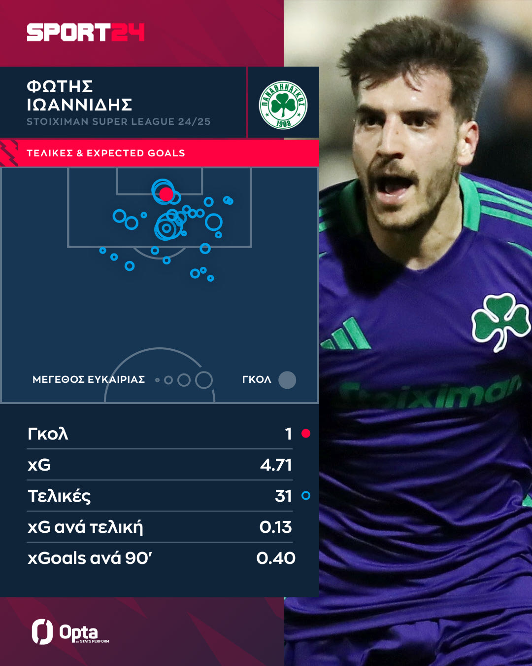 Ο Ιωαννίδης έχει τη φετινή σεζόν 31 τελικές, με συνολική αξία 4.71xG. Δηλαδή, βάσει των ευκαιριών του, θα “έπρεπε” να έχει πετύχει σίγουρα πάνω από ένα γκολ και τουλάχιστον τέσσερα. Επιπλέον, έχει 0.13xG ανά τελική και 0.40xG ανά 90 λεπτά.