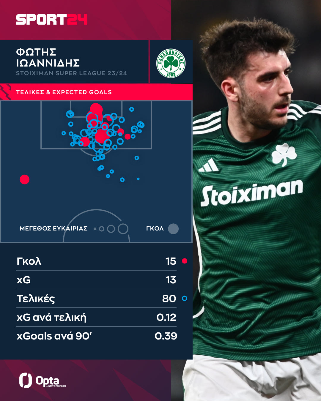Ο Ιωαννίδης, ο οποίος πέρσι πέτυχε 15 γκολ στη Stoiximan Super League, είχε 0.12xG ανά τελική και 0.39xG ανά 90 λεπτά. Δηλαδή ίδιες επιδόσεις με φέτος.