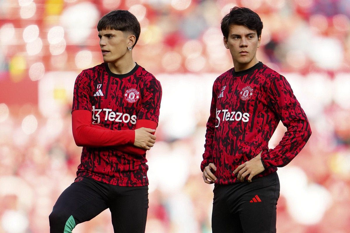 Manchester United's Alejandro Garnacho, from left, Manchester United's Facundo Pellistri and Hannibal Mejbri pause during warm up before the English Premier League soccer match between Manchester United and Brentford at the Old Trafford stadium in Manchester, England, Saturday, Oct. 7, 2023.(AP Photo/Jon Super)
