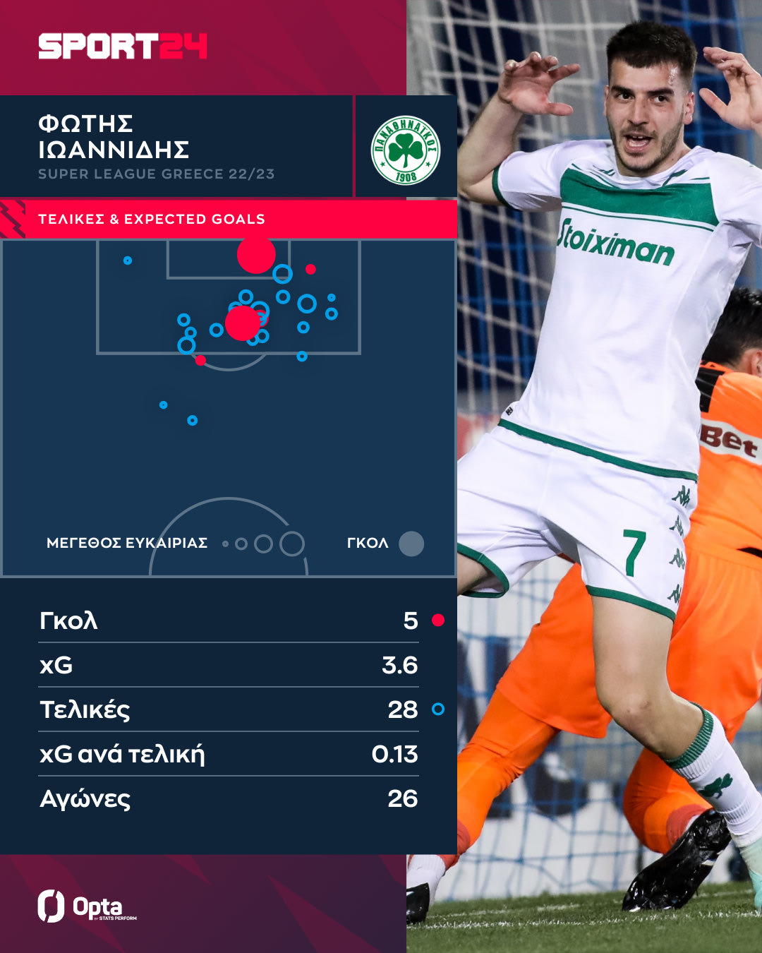 Όπως δείχνει και το σχετικό γράφημα της Opta/Stats Perform ο Ιωαννίδης είναι αρκετά αποτελεσματικός καθώς αν και το σύνολο των xgoal του είναι 3,6 ο ίδιος έχει σημειώσει πέντε τέρματα ενώ συνολικά έχει 28 τελικές.