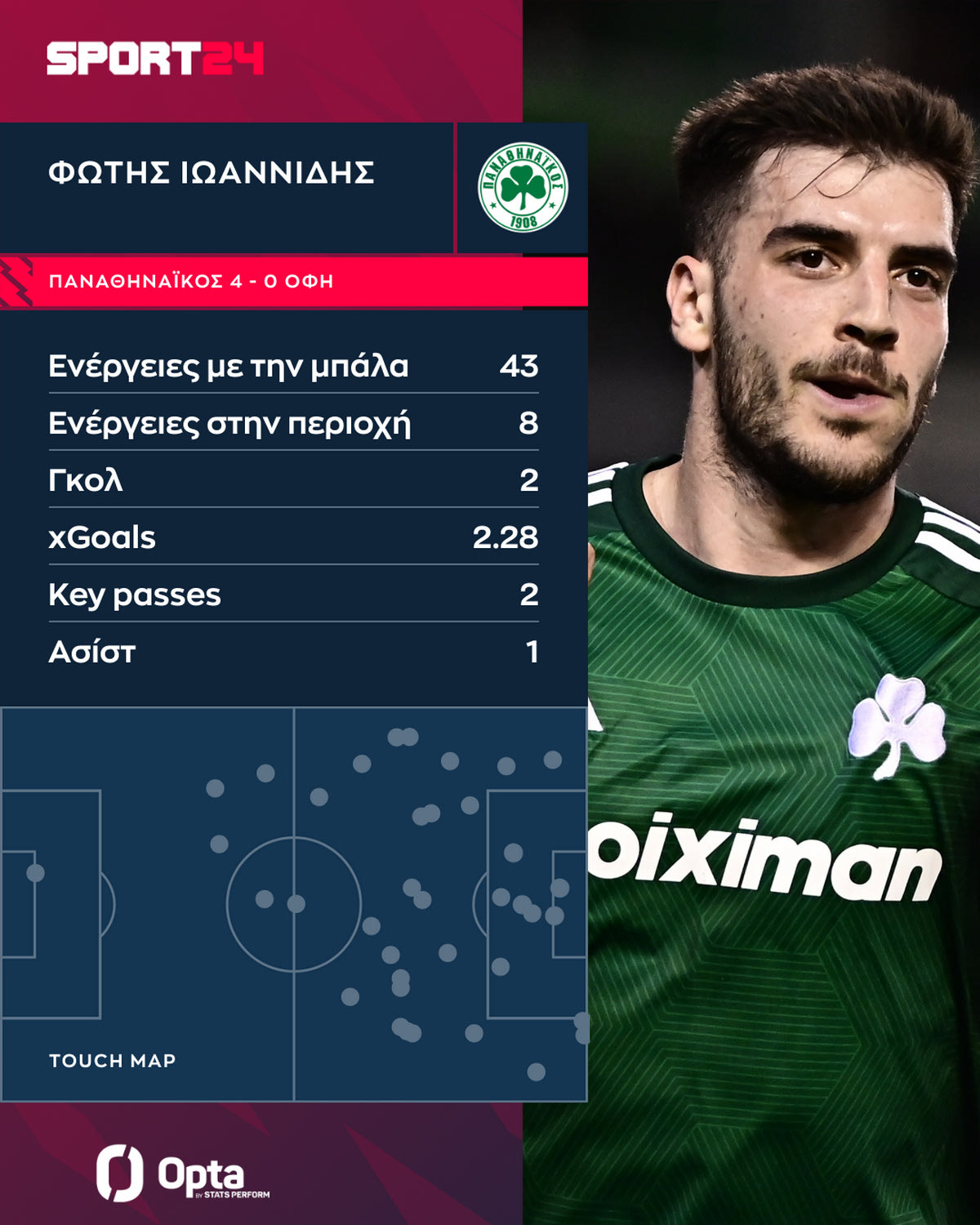 Δύο γκολ, μια ασίστ, ένα κερδισμένο πέναλτι, ένα δοκάρι και δύο key passes ήταν ο απολογισμός του Φώτη Ιωαννίδη στην αναμέτρηση με τον ΟΦΗ και το ευρύ 4-0 του Παναθηναϊκού επί των Κρητικών με τους πράσινους να επιστρέφουν στα θετικά αποτελέσματα και να κατακτούν τον τίτλο του πρωταθλητή χειμώνα στη Stoiximan Super League.