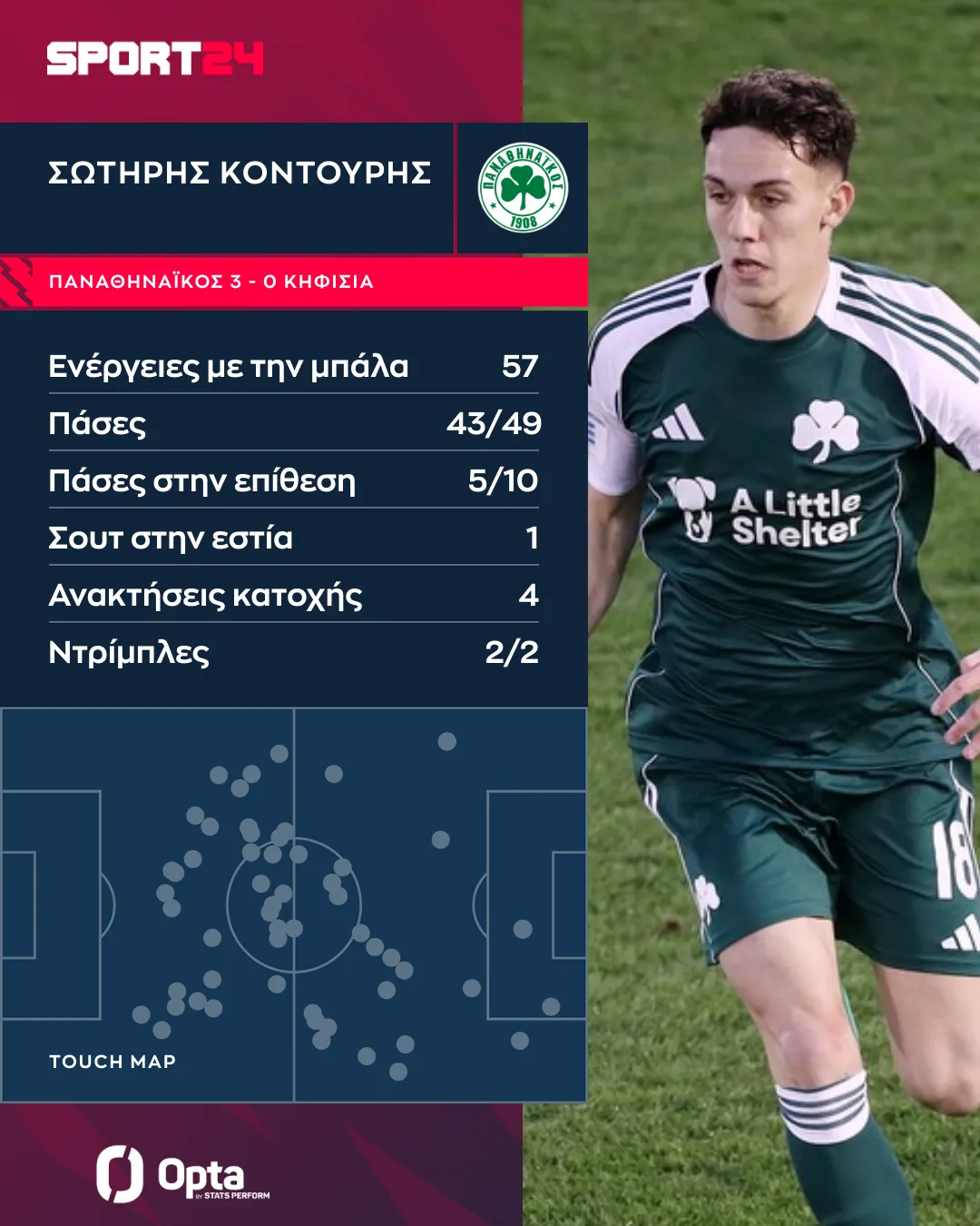 Αν σταθεί κανείς στα δεδομένα της Opta/Stats Perform, το αποτύπωμά του στο παιχνίδι γίνεται ακόμη πιο ξεκάθαρο. Ο Κοντούρης κατέγραψε 57 ενέργειες με την μπάλα, καλύπτοντας σχεδόν όλο τον άξονα.