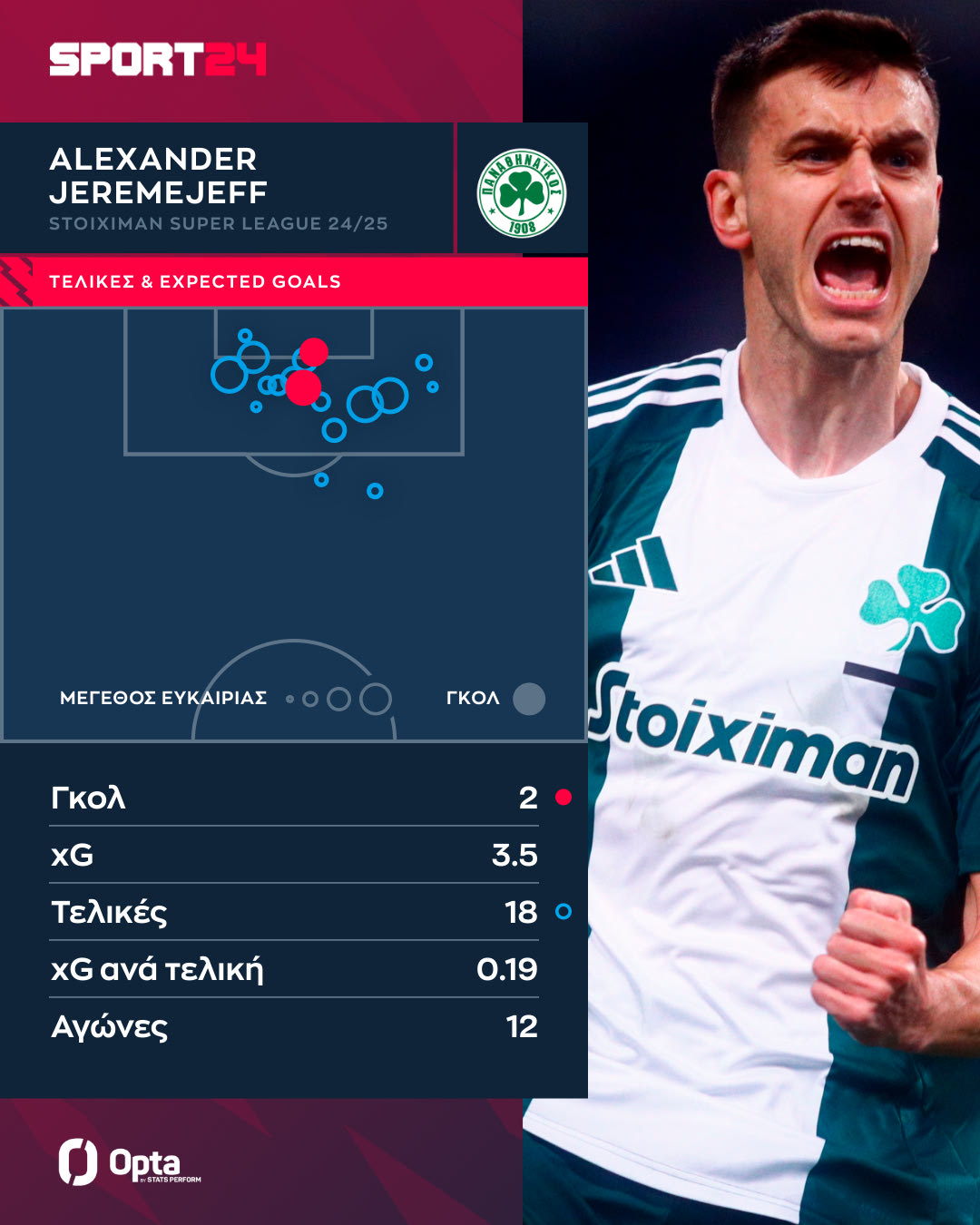Στα 480 λεπτά που έχει αγωνιστεί έχει 18 τελικές με συνολική “αξία” 3.5xGoals. Ο Γερεμέγεφ είναι “φωτιά” μέσα στην περιοχή και αυτό φαίνεται από τους μεγάλους κύκλους του γραφήματος, που δείχνουν τις μεγάλες ευκαιρίες του. Ο στράικερ των πρασίνων έχει 0.19xG ανά τελική και αποδεικνύει πόσο απειλητικός μπορεί να γίνει.
