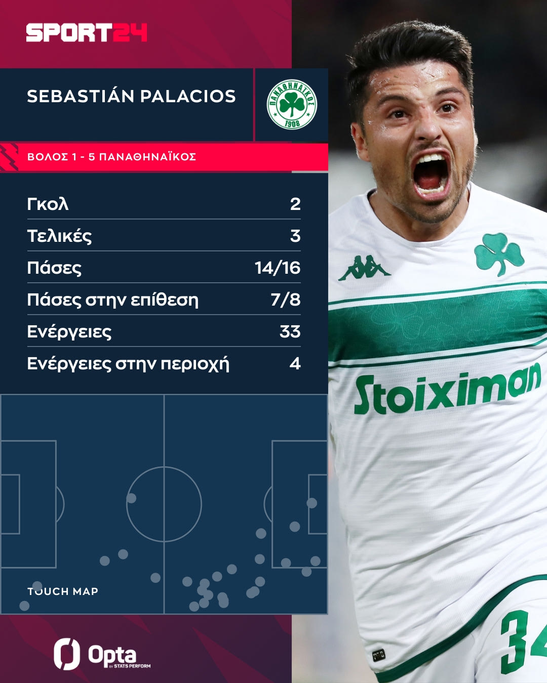 Είχε συνολικά 33 ενέργειες με την μπάλα, ενώ τέσσερις εξ αυτών ήταν στην περιοχή του Βόλου. Ο Παλάσιος ήταν αποτελεσματικός, καθώς από τις τρεις τελικές του συνολικά, οι δύο κατέληξαν στα δίχτυα. Βοήθησε μάλιστα και δημιουργικά τον Παναθηναϊκό με 7/8 πάσες στην επίθεση.