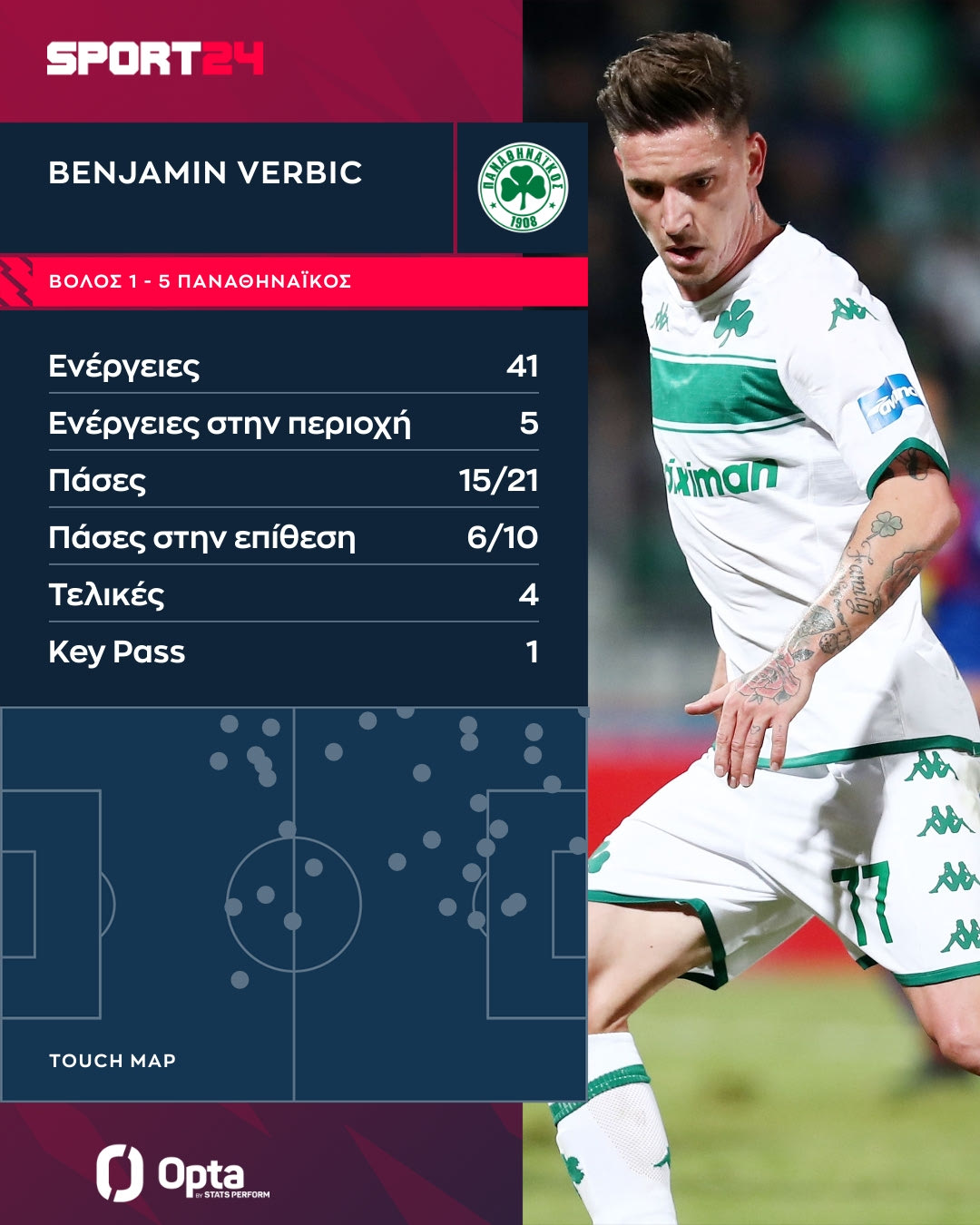 Όπως έπραξε ο Παλάσιος στα δεξιά, έτσι και ο Βέρμπιτς έκανε δική του την αριστερή πτέρυγα, με συχνή παρουσία στην περιοχή των Θεσσαλών. Είχε πέντε ενέργειες στην περιοχή του Βόλου, λιγότερες μόνο από τον κεντρικό επιθετικό του Παναθηναϊκού, τον Σπόραρ (8).