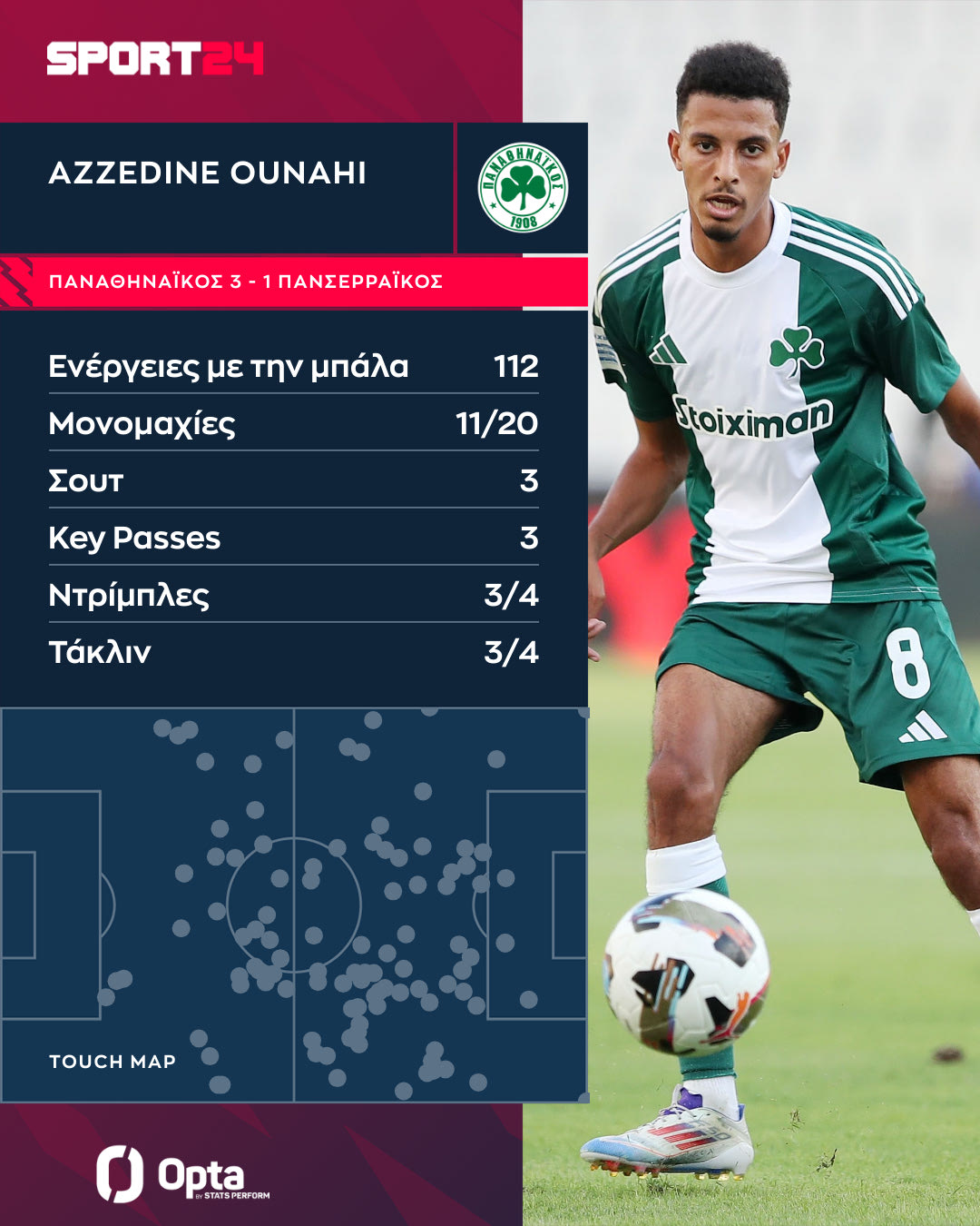 Στο γράφημα της Opta/Stats Perform μπορείτε να δείτε όλες τις ενέργειες του Αζεντίν Ουναχί στην αναμέτρηση του Παναθηναϊκού απέναντι στον Πανσερραϊκό.