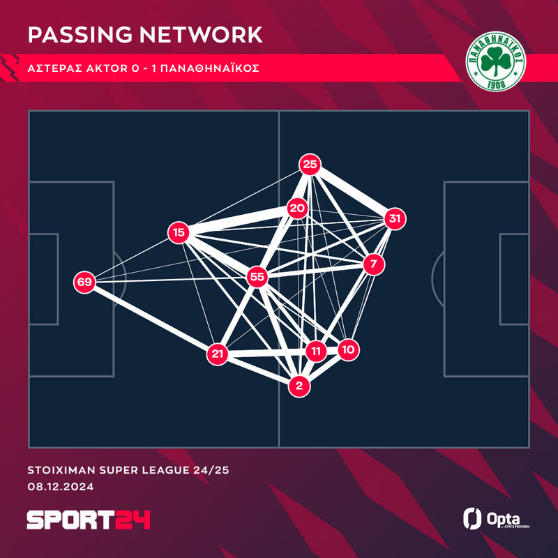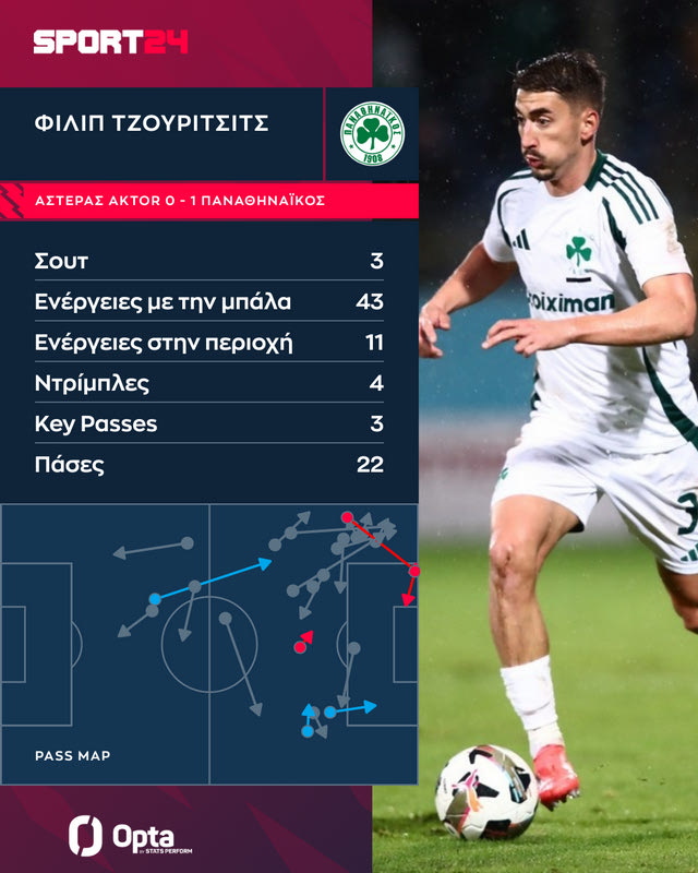 Ο Σέρβος κινήθηκε πιο ψηλά στο γήπεδο από κάθε άλλο παίκτη του Παναθηναϊκού, κάτι που αποδεικνύεται από το γράφημα της Opta/Stats Perform. Ο Τζούριτσις, με το νούμερο 31, συνεργάστηκε σε μεγάλο βαθμό με τον Μλαντένοβιτς προσπαθώντας να δημιουργήσει ρήγματα στη δεξιά πλευρά του Αστέρα AKTOR αλλά και με τον Φώτη Ιωαννίδη που κινήθηκε στο πλάι του.