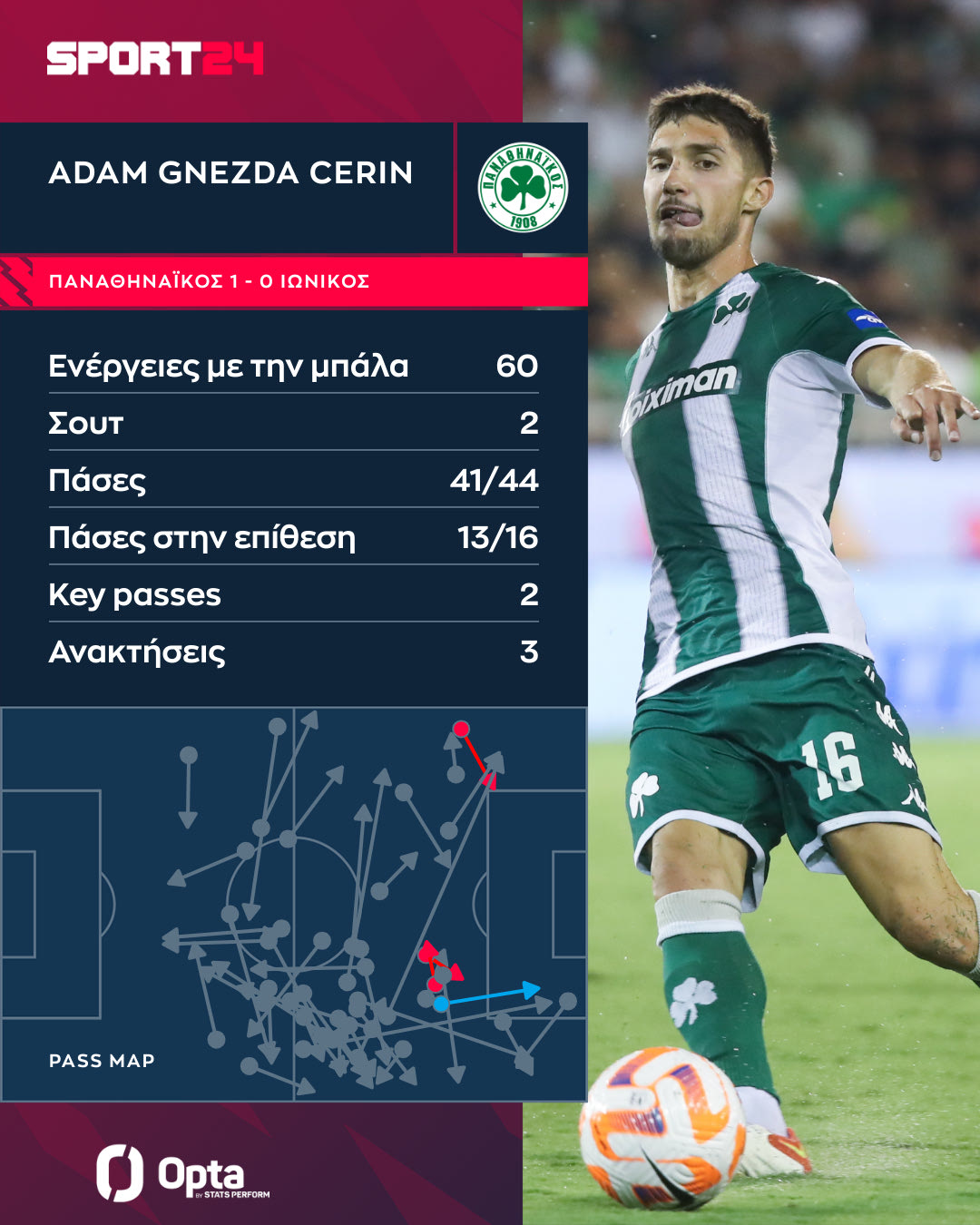 Όπως βλέπει κανείς και από το γράφημα της Opta ο Τσέριν κινήθηκε κατά μήκος και πλάτος όλου του γηπέδου αλλά περισσότερο έπαιξε από τα δεξιά όπου συνεργάστηκε με τους Κώτσιρα και Σπόραρ στη δημιουργία ευκαιριών του Παναθηναϊκού στο ματς με τον Ιωνικό.