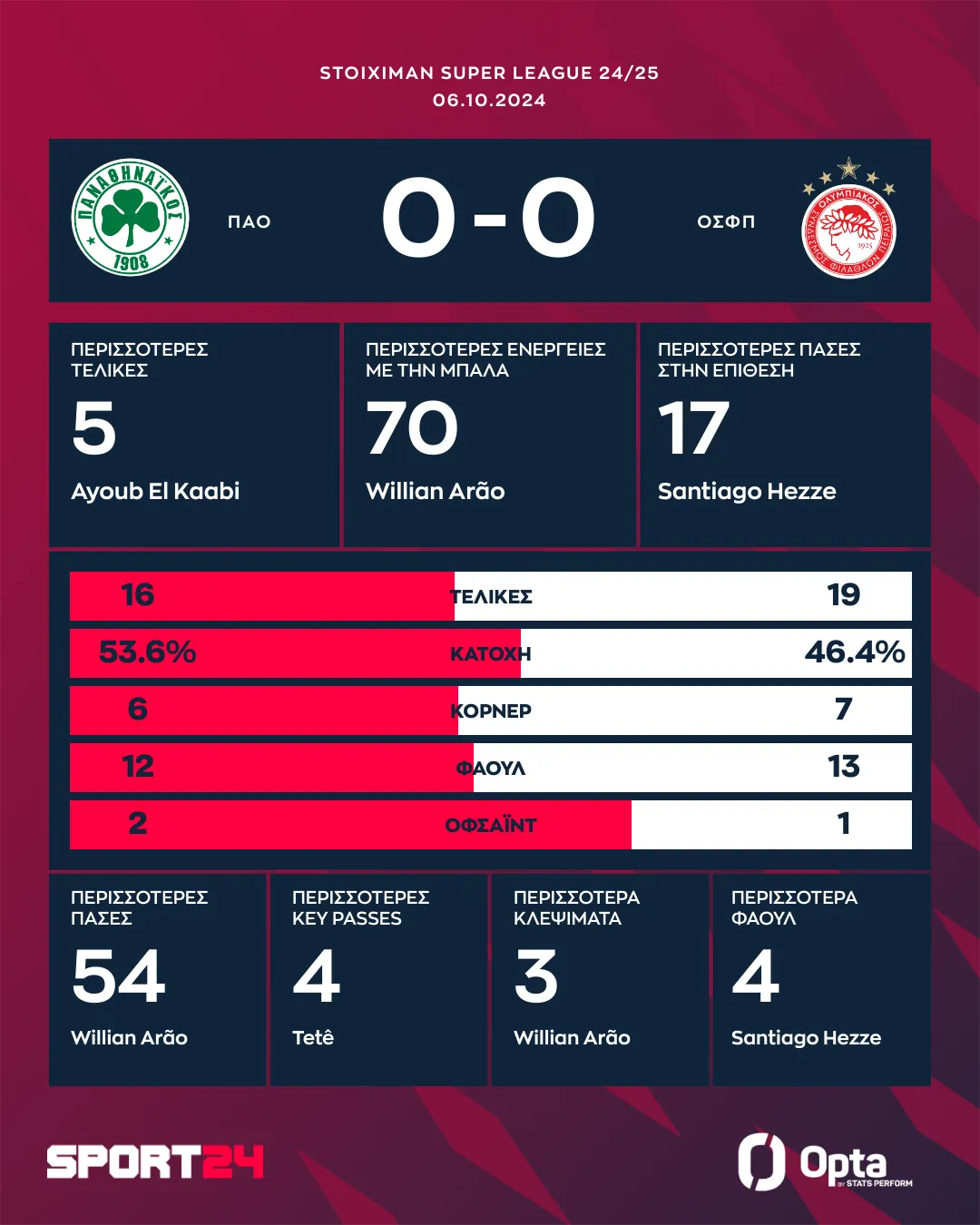 Το πρώτο ντέρμπι των αιωνίων της σεζόν 2024/25 δεν είχε νικητή. Η μάχη ανάμεσα στον Παναθηναϊκό και τον Ολυμπιακό στο ΟΑΚΑ για την 7η αγωνιστική της Stoiximan Super League έληξε ισόπαλη 0-0.