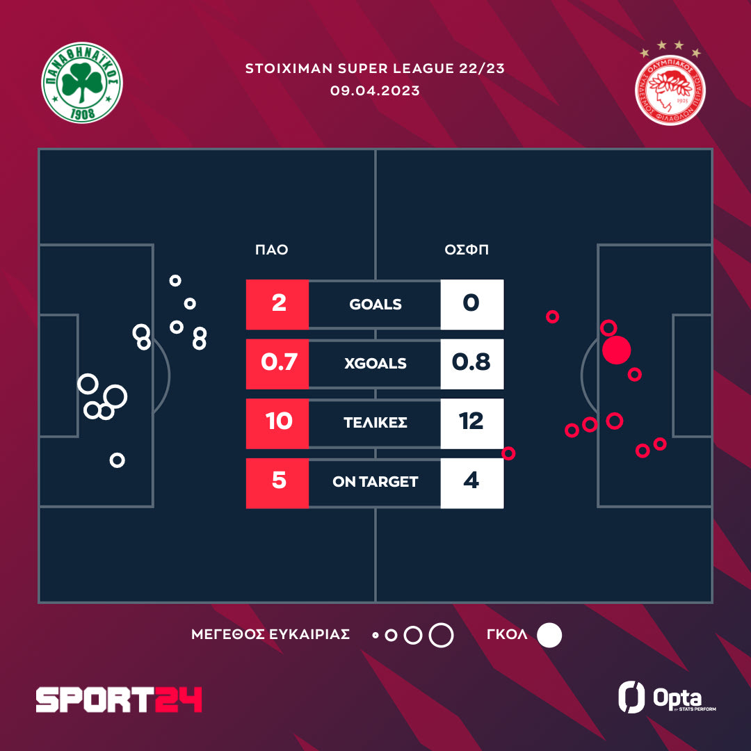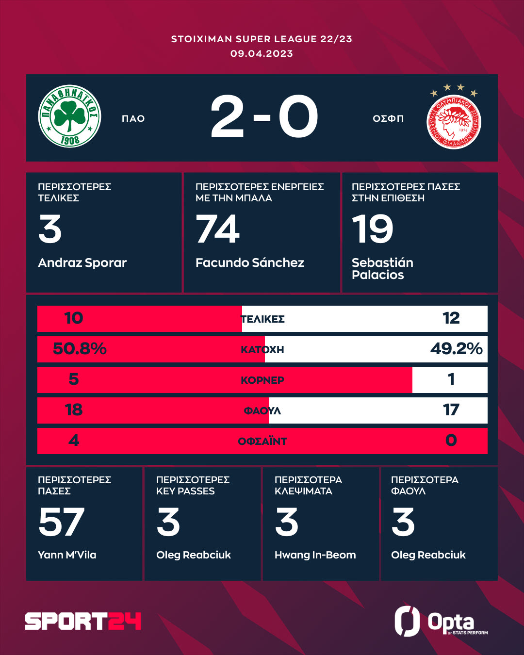 Παράλληλα το τριφύλλι για όγδοο σερί ματς κράτησαν το μηδέν στην άμυνα και δεν άφησαν τον Ολυμπιακό να φτιάξει καθαρές ευκαιρίες μπροστά από την εστία του Μπρινιόλι, εκτός από μια με τον Μασούρα στο πρώτο μέρος.