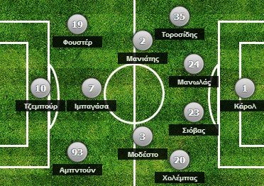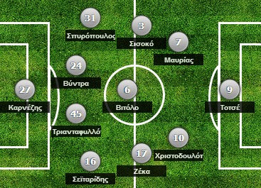 Ο Λεονάρντο Ζαρντίμ επέλεξε το 4-2-3-1 και μια 11άδα βγαλμένη από πέρσι καθώς οι μόνοι νέοι παίκτες ήταν αναγκαστικά στο κεντρικό αμυντικό δίδυμο (Σιόβας, Μανωλάς). Στο τέρμα επιλέχθηκε ο Κάρολ, δεξί μπακ ο Τοροσίδης και αριστερό ο Χολέμπας. Τα δύο αμυντικά χαφ οι Μοδέστο και Μανιάτης, με τον Ιμπαγάσα να βρίσκεται μπροστά τους. Στα δεξιά του Αργεντίνου ο Φουστέρ (που προτιμήθηκε του Μασάδο), αριστερά ο Αμπντούν και κορυφή ο Τζεμπούρ αντί του Μήτρογλου.