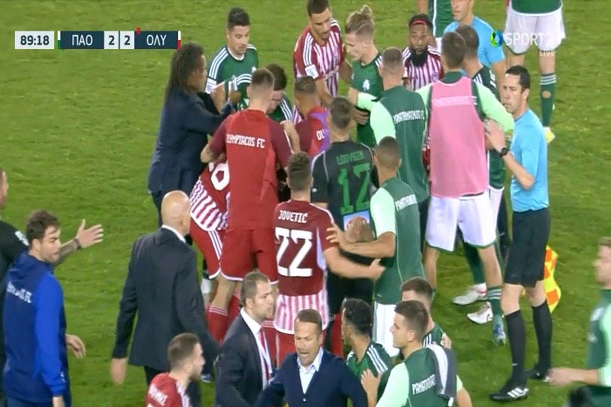 Άναψαν τα αίματα ανάμεσα στους παίκτες του Παναθηναϊκού και του Ολυπιακού στο 89΄, μετά την αποβολή του Ποντένσε με δεύτερη κίτρινη κάρτα.