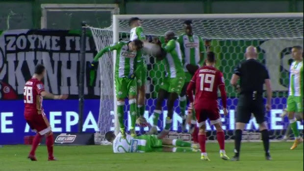 Ο Ματιέ Βαλμπουενά εκτέλεσε φάουλ στο 88′ του ντέρμπι με τον Παναθηναϊκό και η μπάλα χτύπησε πάνω στον Σανκαρέ, που είχε σχηματίσει τείχος με τους συμπαίκτες του.
