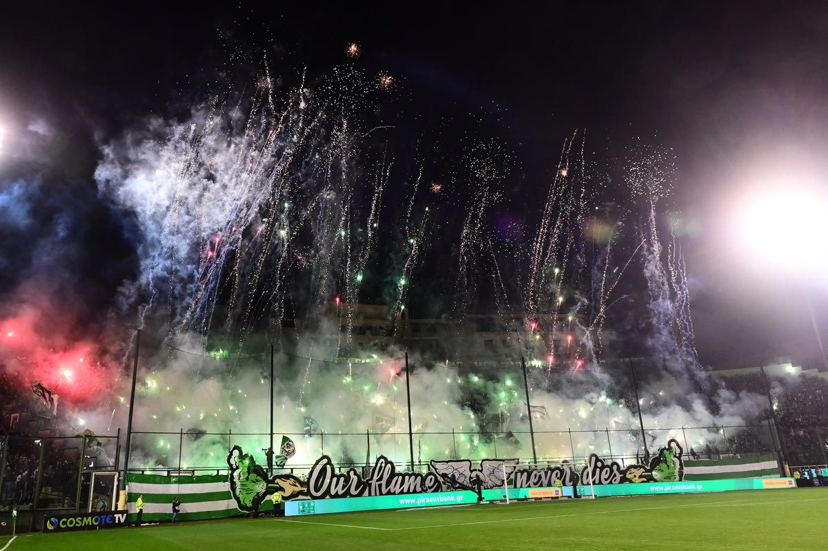 Παναθηναϊκός – Ολυμπιακός: Η εντυπωσιακή ατμόσφαιρα με εκατοντάδες πυροτεχνήματα στην είσοδο των ομάδων