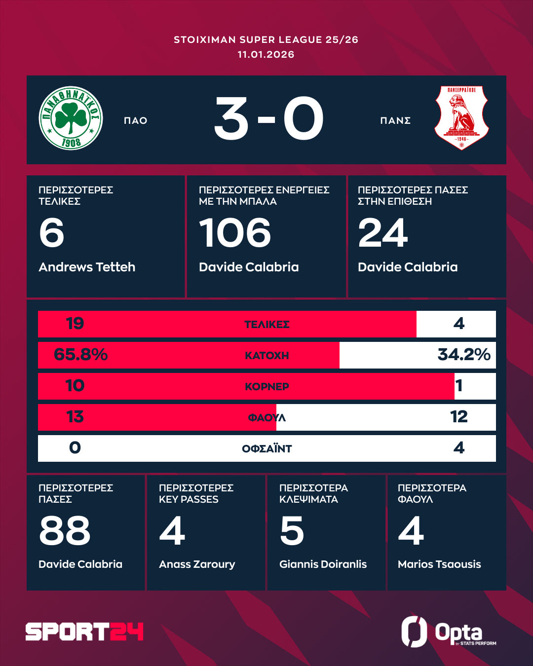 Ο Παναθηναϊκός έκανε ποδαρικό στο 2026, καθώς επικράτησε 3-0 του Πανσερραϊκού για την 16η αγωνιστική της Stoiximan Super League στο ντεμπούτο του Τεττέη. Τζούριτσιτς (4′), Ζαρουρί (15′) και Γεντβάι (39′) τα γκολ του Τριφυλλιού.