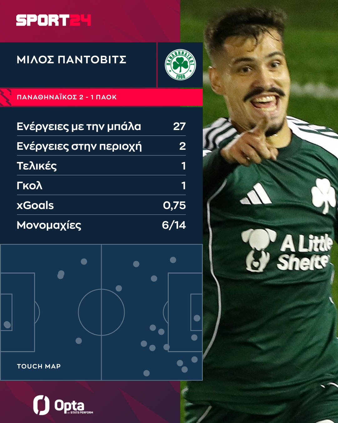 Ο Μίλος Πάντοβιτς μπήκε από το… παραθυράκι στην ενδεκάδα του Παναθηναϊκού και έκρινε το ντέρμπι με τον ΠΑΟΚ. Η εμφάνιση του διεθνούς Σέρβου φορ μέσα από τα στοιχεία της OPTA/Stats Perform, που δεν αποκλείεται να αναθεωρήσει τα πλάνα του Ράφα Μπενίτεθ στην ιεραρχία των επιθετικών του “τριφυλλιού”.
