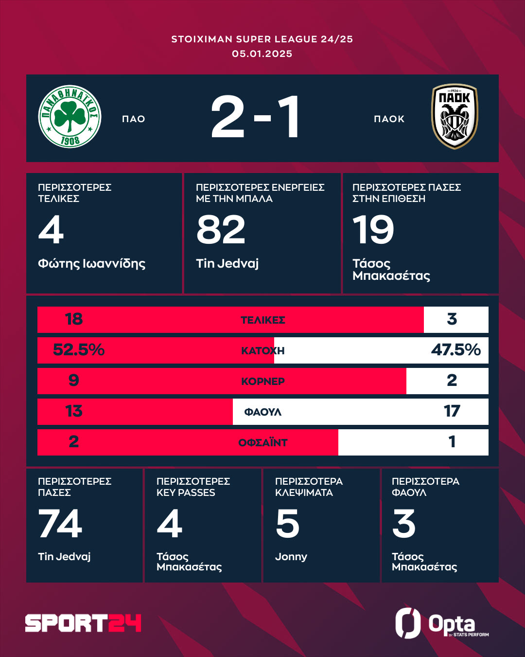 Το πρώτο ντέρμπι της χρονιάς βάφτηκε πράσινο, καθώς ο Παναθηναϊκός νίκησε 2-1 τον ΠΑΟΚ στο ΟΑΚΑ. Ο Ζίβκοβιτς άνοιξε το σκορ στο 2', ο Ιωαννίδης απάντησε στο 12' και ο Ουναχί έκανε την ανατροπή στο 90'. Οι Θεσσαλονικείς ολοκλήρωσαν το ματς με δέκα παίκτες λόγω της αποβολής του Μπάμπα στο 60ο λεπτό.