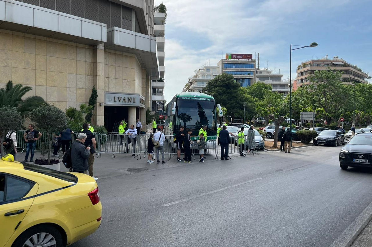 Το πούλμαν του Παναθηναϊκού σε σχέση με τις άλλες φορές είναι στην πλαϊνή έξοδο του ξενοδοχείου, περικυκλωμένο από σεκιούριτι και κάγκελα. Είναι πολύ πιθανό να βγουν οι παίκτες από εκεί και να μην έρθουν σε επαφή με τον κόσμο, καθώς ταλαιπωρούνται από τον κορονοϊό.
