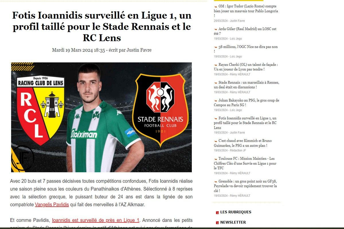 Το “jeunesfooteux.com” με τίτλο “Ο Φώτης Ιωαννίδης παρακολουθείτε από ομάδες της Ligue 1, το προφίλ του ταιριάζει σε Ρεν και Λιλ” και με σχετική φωτογραφία έχει ένα ρεπορτάζ αναφορικά με τις φετινές επιδόσεις του Έλληνα στράικερ, το ποσό που εκτιμάται πως θα ζητήσει ο Παναθηναϊκός ενώ βάζει στο παιχνίδι και ομάδες από τη Γερμανία και την Ιταλία.
