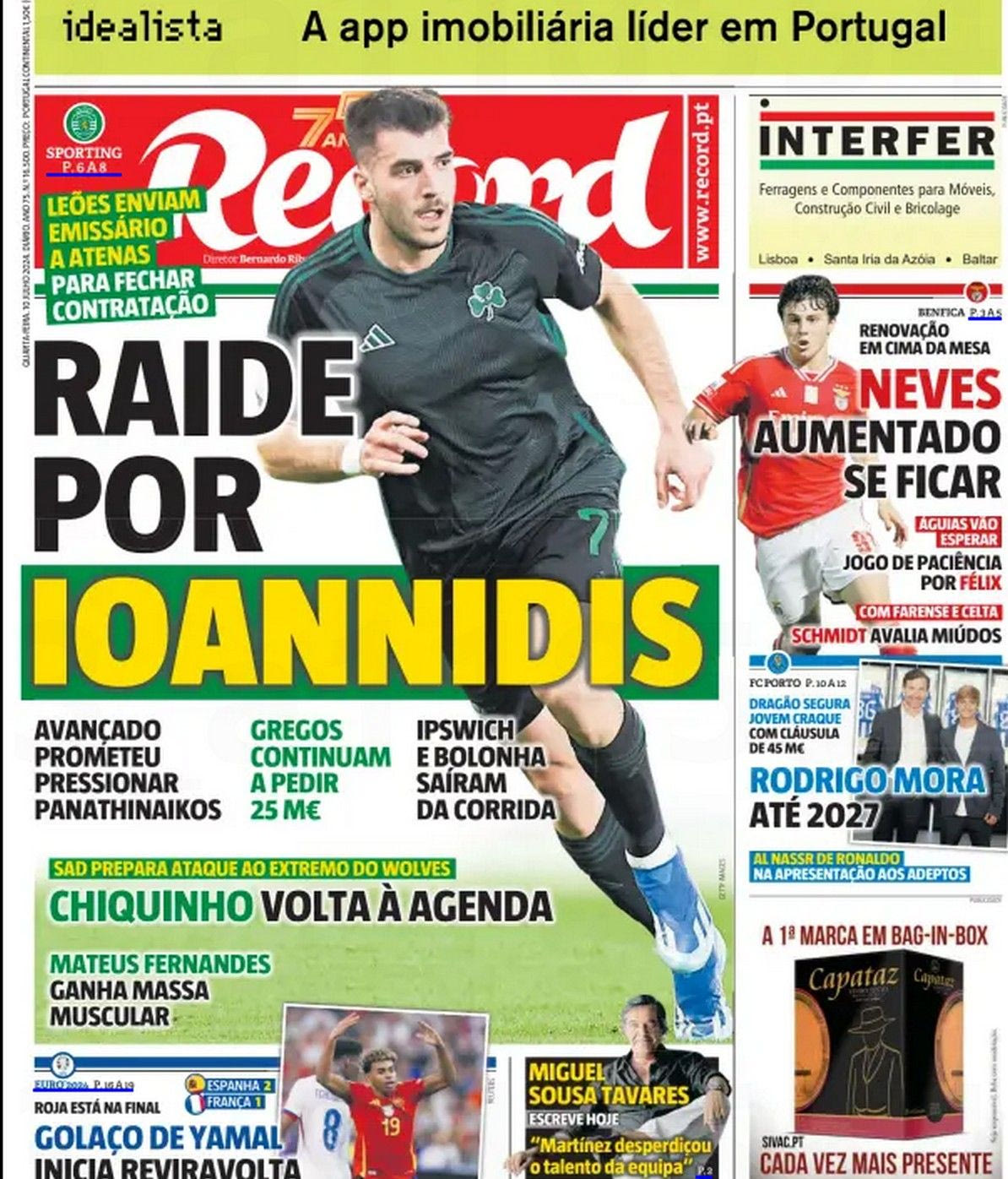 Η Σπόρτινγκ επανέρχεται για τον Φώτη Ιωαννίδη με την Record στο πρωτοσέλιδο της να σημειώνει πως άνθρωπος των Πορτογάλων θα βρεθεί στην Αθήνα για να αποσπάσει τη θετική απάντηση των πράσινων.