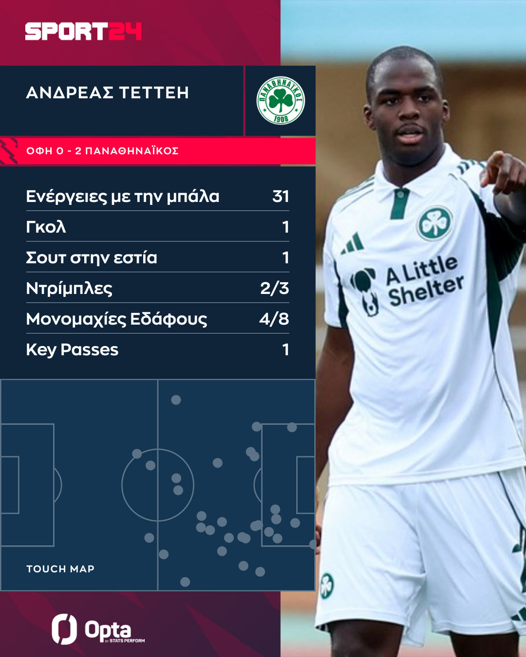 Η εικόνα του Τεττέη απέναντι στον ΟΦΗ αποτυπώνει έναν επιθετικό που εξελίσσεται σε κομβικό γρανάζι του Παναθηναϊκού. Ο Έλληνας διεθνής είχε 31 επαφές με την μπάλα, με έντονη παρουσία μέσα και γύρω από την αντίπαλη περιοχή και τις επτά επαφές να έρχονται μέσα από αυτή.