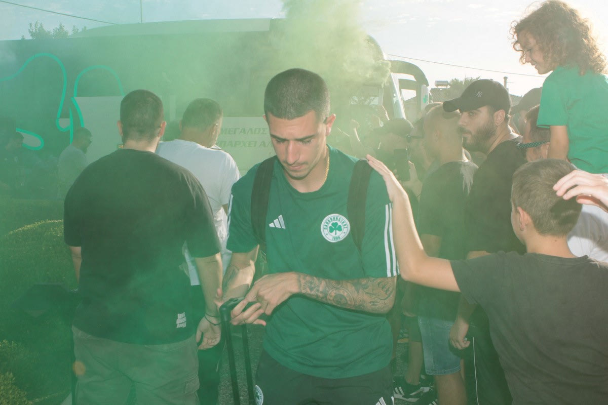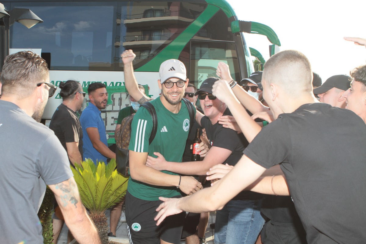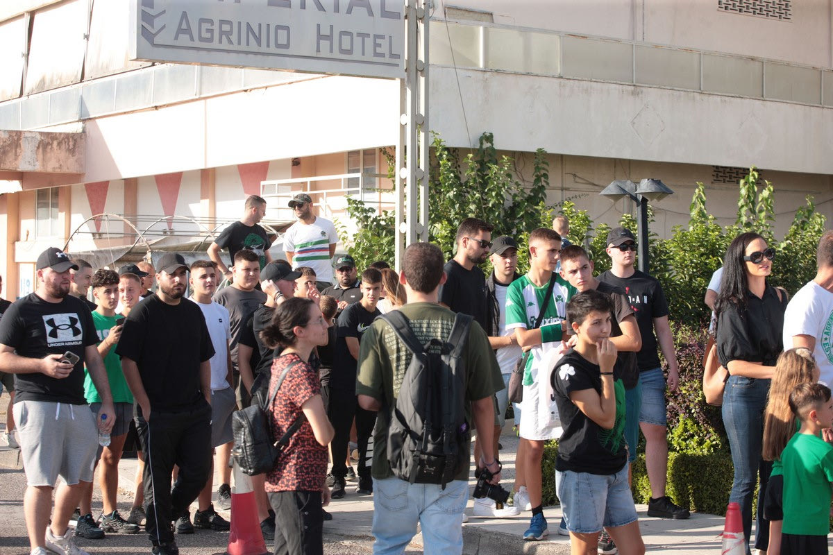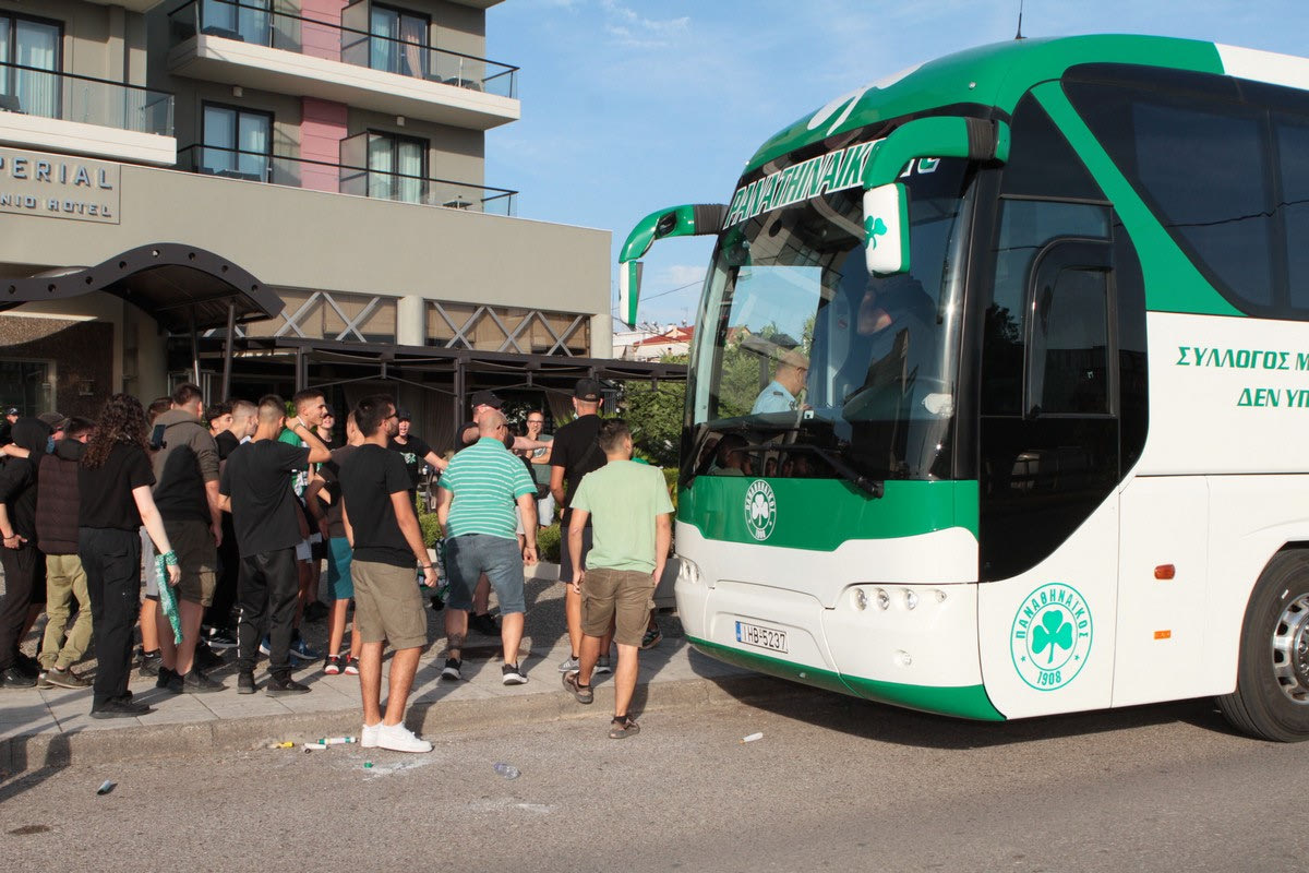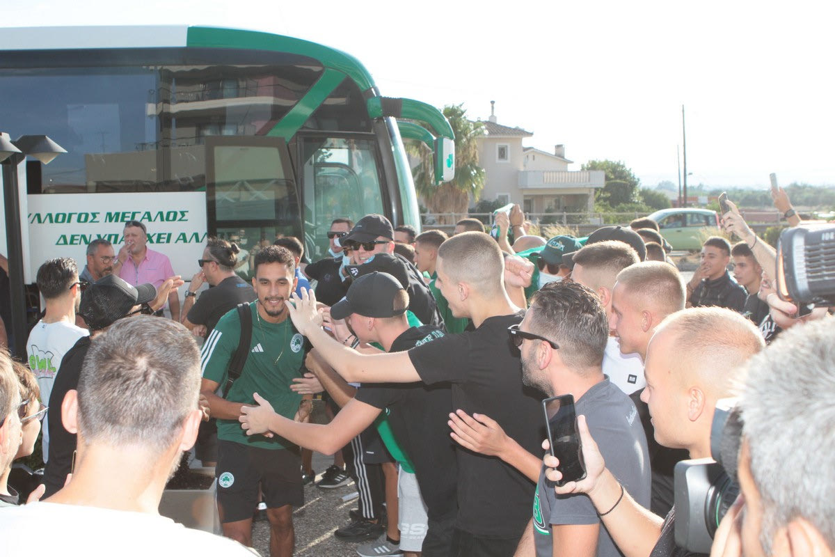 Οι οπαδοί των πράσινων περίμεναν έξω από το ξενοδοχείο και στη θέα του πούλμαν άρχισαν να φωνάζουν συνθήματα ενώ κατά την έξοδο των ποδοσφαιριστών ζήτησαν το διπλό στο ματς με τον Παναιτωλικό.