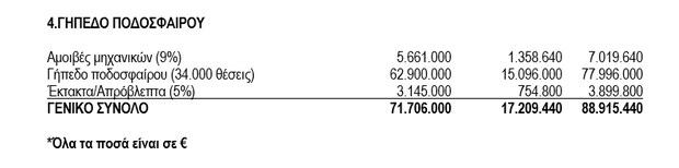 Από εκεί και πέρα όμως, εάν συμπεριληφθεί και ο ΦΠΑ (ύψους 24%), το όλον -μεικτό- κόστος για το ποδοσφαιρικό γήπεδο (με τις αμοιβές των μηχανικών και τα έξοδα ανέγερσης), ανεβαίνει στα 85.015.640€.
