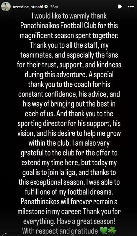 “Θα ήθελα να ευχαριστήσω θερμά τον Παναθηναϊκό για αυτή την εκπληκτική σεζόν που περάσαμε μαζί. Ευχαριστώ όλο το τιμ, τους συμπαίκτες μου και κυρίως τους οπαδούς για την εμπιστοσύνη, τη στήριξη και την καλοσύνη κατά τη διάρκεια αυτής της περιπέτειας. Ένα ξεχωριστό ευχαριστώ στον προπονητή για τη συνεχή του εμπιστοσύνη, τις συμβουλές του και τον τρόπο του στο να βγάζει τον καλύτερο εαυτό μας.