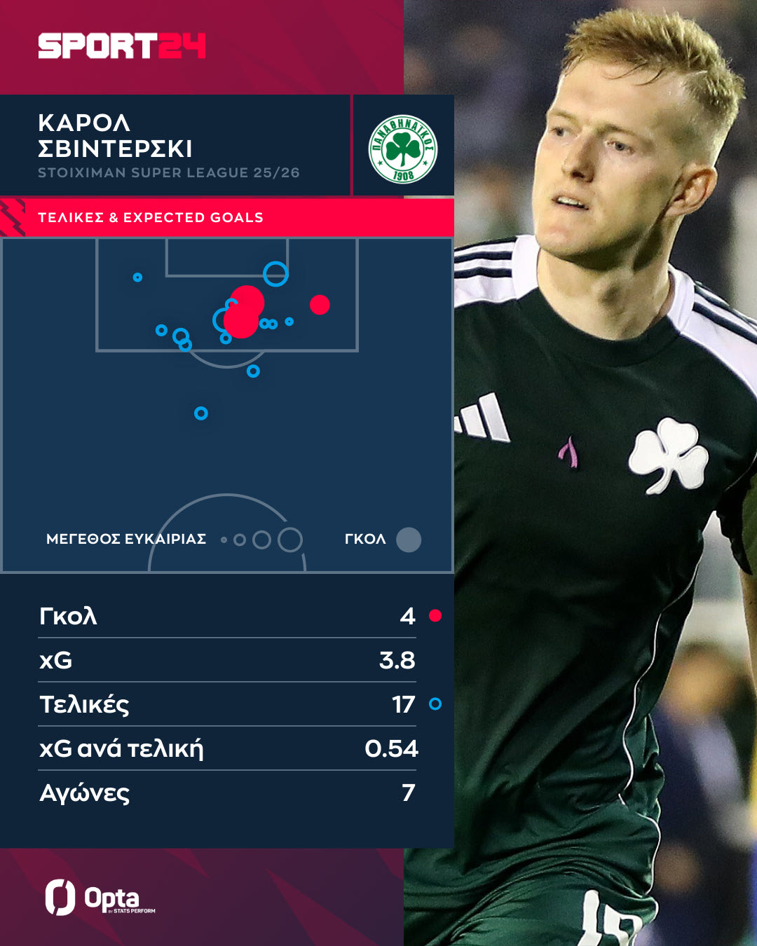 Η λεπτή ισορροπία του βάρους να είσαι ο αντι-Ιωαννίδης και να “απαγορεύεται” να χάσεις ματς για να δώσεις τον απαιτούμενο χρόνο στον Σίριλ Ντέσερς ώστε να επιστρέψει ομαλά από τον τραυματισμό του. Το SPORT24 με τη βοήθεια της OPTA/Stats Perform σάς παρουσιάζει τα στατιστικά του Κάρολ Σβιντέρσκι σε διάφορες κατηγορίες στη Stoiximan Super League.