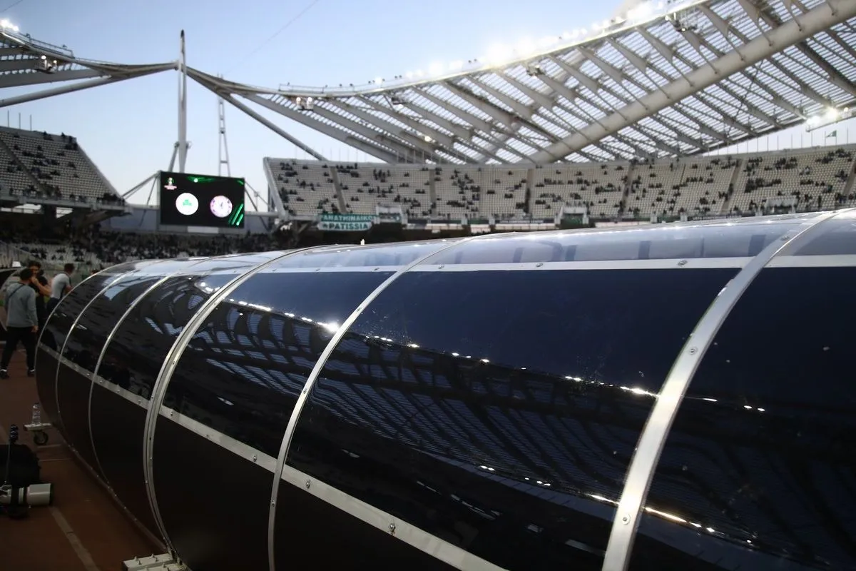 Οι πάγκοι του Παναθηναϊκού και της Τσέλσι ήταν στα μαύρα, χωρίς τα λογότυπα των ομάδων, ως πένθος για τον θάνατο του Τζορτζ Μπάλντοκ.