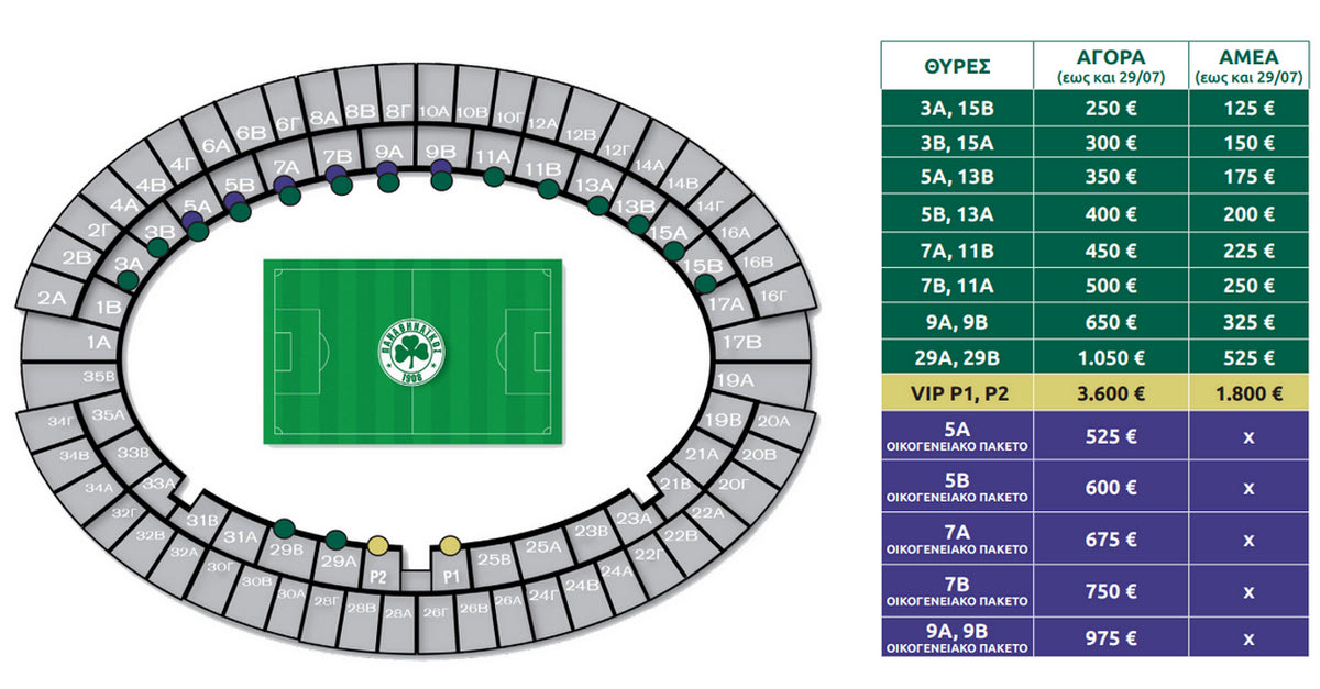 Μετά τη Δευτέρα (22/7) θα “ανοίξει” η διάθεση και για τους υπόλοιπους φιλάθλους, ενώ όπως γνωστοποίησε ο Παναθηναϊκός “…για τα ισχύοντα από Τρίτη 30 Ιουλίου και έπειτα θα ακολουθήσει νεότερη ανακοίνωση για τη δυνατότητα αγοράς εισιτηρίου διαρκείας”.