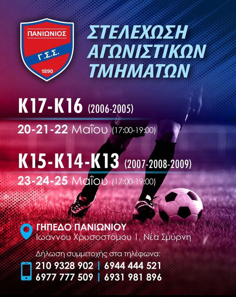 Ο Πανιώνιος έκανε γνωστό πως ξεκινούν τα δοκιμαστικά για τις Ακαδημίες του στις 20-22 Μαΐου για την κατηγορία Κ16-Κ17 και στις 23-25 Μαΐου για τις κατηγορίες των Κ15-Κ14-Κ13.