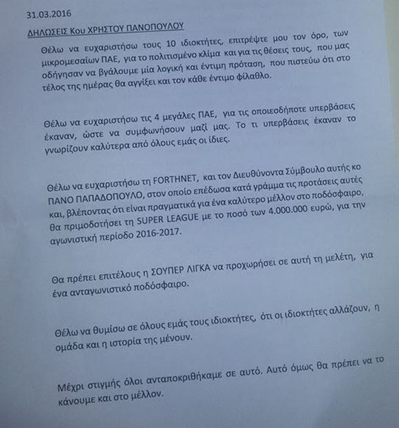 Θέλουμε να ευχαριστήσουμε τις 4 μεγάλες ΠΑΕ για τις οποιεσδήποτε υπερβάσεις έκαναν για να συμφωνήσουν μαζί μας. Να πω (ΑΕΚ, Ολυμπιακός, Παναθηναϊκός, ΠΑΟΚ) συμφώνησαν με τις προτάσεις που κάναμε. Θέλω να ευχαριστήσω την Forthnet έχοντας καταθέσει στο διευθύνοντα σύμβουλο Κ. Παπαδόπουλο τις προτάσεις μας. Μετά από λίγες ημέρες έχοντας βρεθεί μαζί του πήρα την άποψη ότι στηρίζουμε αυτό το θετικό που γίνεται όσον αφορά το επαγγελματικό ποδόσφαιρο, την διαιτησία και την αναδιανομή των πόρων γιατί μέσα από αυτό και ένα μεγάλο κομμάτι της βίας που αντιμετωπίζουμε θα εξαφανιστεί.