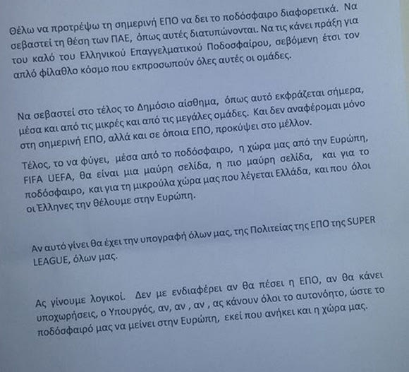 Τέλος το να φύγει μέσα από το ποδόσφαιρο η χώρα μας από την Ευρώπη θα είναι μία μαύρη σελίδα η πιο μαύρη σελίδα για τη μικρή χώρα μας. Όλοι οι Έλληνες την θέλουμε στην Ευρώπη. Αν αυτό γίνει θα έχει την υπογραφή όλων μας. Της πολιτείας, της ΕΠΟ αλλά και εμάς των παραγόντων της Super League. Ας γίνουμε λογικοί. Δεν μας ενδιαφέρει αν θα πέσει η ΕΠΟ, αν θα κάνει υποχωρήσεις ο υπουργός. Ας κάνουν το αυτονόητο όλοι για να μείνει εκεί που ανήκει το ποδόσφαιρο μας. Στην Ευρώπη.