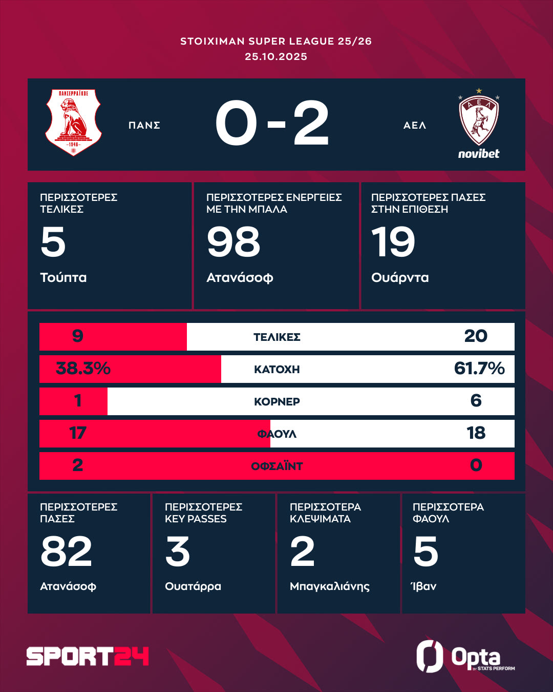 Στο 44′ το σύνολο του Στέλιου Μαλεζά πήρε κεφάλι στο σκορ με δύο τέρματα. Ο Παπαγεωργίου έκανε ακόμη μία εξαιρετική σέντρα από τα δεξιά, ο Ουάρντα “τρύπωσε” στην άμυνα τον γηπεδούχων και με κεφαλιά εκτέλεσε τον Τιναλίνι για το Πανσερραϊκός – ΑΕΛ Novibet 0-2.