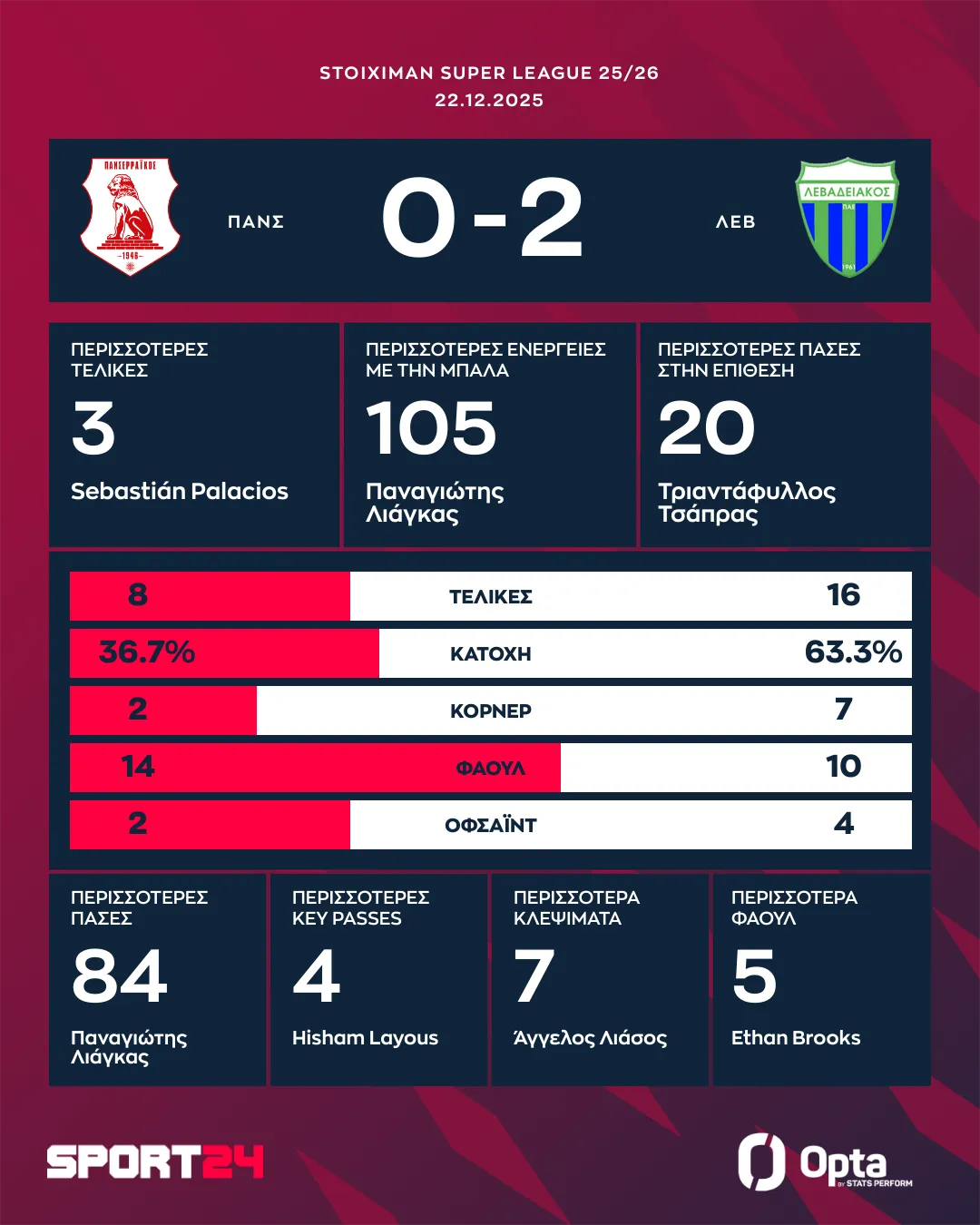 Ο Λεβαδειακός πήρε το διπλό από την έδρα του Πανσερραϊκού χωρίς να πιεστεί ιδιαίτερα, καθώς επικράτησε 2-0 χάρη στα γκολ των Βέρμπιτς και Πεντρόσο. Οι γηπεδούχοι ολοκλήρωσαν το ματς με εννέα παίκτες.