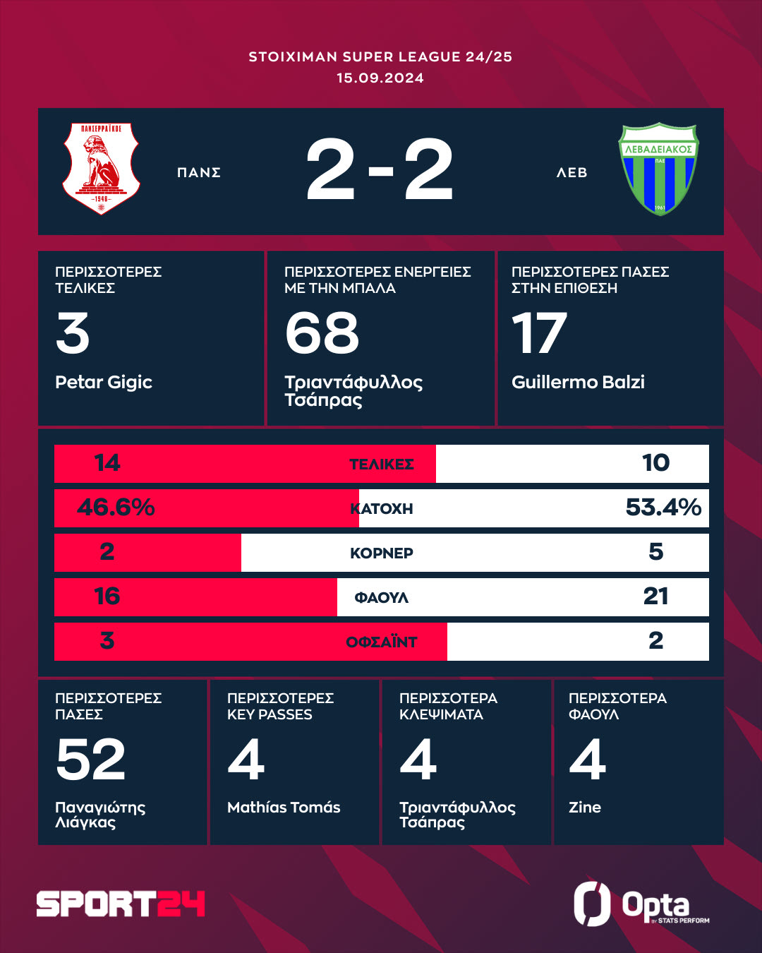 Η μάχη στις Σέρρες μεταξύ Πανσερραϊκού και Λεβαδειακού ήταν μοιρασμένη με τις δύο ομάδες να έχουν από ένα καλό 45λεπτο. Στο καλό τους διάστημα πέτυχαν από δύο γκολ και πήραν από ένα βαθμό χάρη στο 2-2.