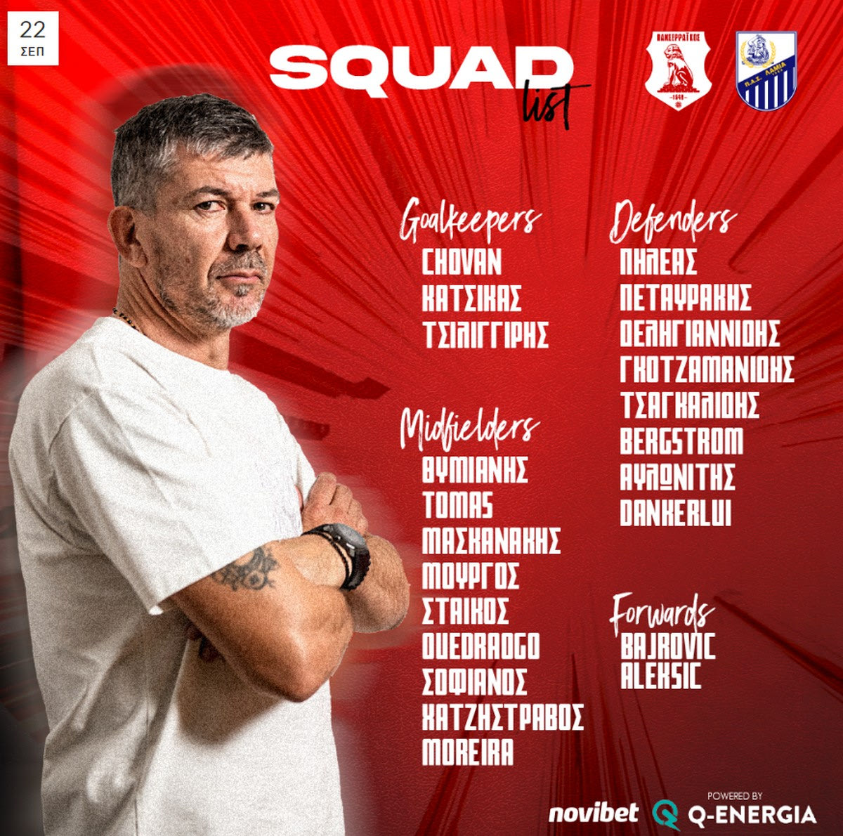 Εκτός αποστολής έμειναν οι Στίνα, Γούλερι, Κολομπίνο που αντιμετωπίζουν προβλήματα τραυματισμών, ο τιμωρημένος Χάγιεκ και οι Καρασαλίδης, Οικονόμου, Τσομπανίδης, Παπαβασιλείου, Ανάκογλου”.