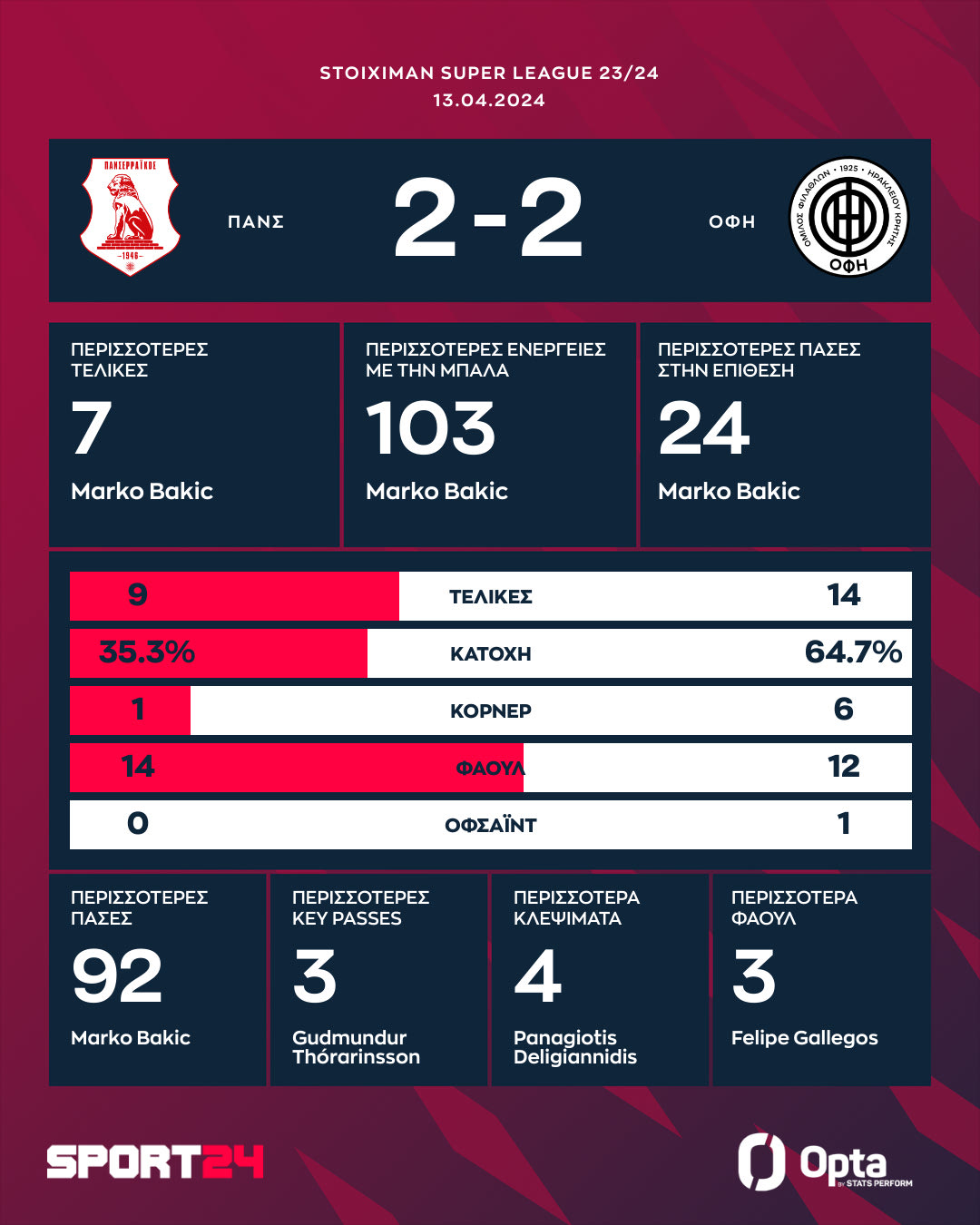 Ο ΟΦΗ ανέβασε την απόδοσή του και κατάφερε στην πρώτη του καλή στιγμή στο δεύτερο μέρος έφερε το ματς στα ίσα. Ο Μοσκέρα κέρδισε την κόντρα από τα αριστερά, έβγαλε στον Μπάκιτς, ο οποίος με τη μία στην καρδιά της περιοχής, έστειλε την μπάλα στην συμβολή των δοκαριών και στη συνέχεια στα δίχτυα.