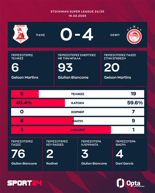 Έτσι ο Ολυμπιακός επέστρεψε στην κορυφή της βαθμολογίας, στο +2 από την ΑΕΚ, μία εβδομάδα πριν το ντέρμπι με τον ΠΑΟΚ στο “Γ. Καραϊσκάκης”. Από την άλλη μεριά, ο Πανσερραϊκός έμεινε στην 11η θέση με 22 βαθμούς.