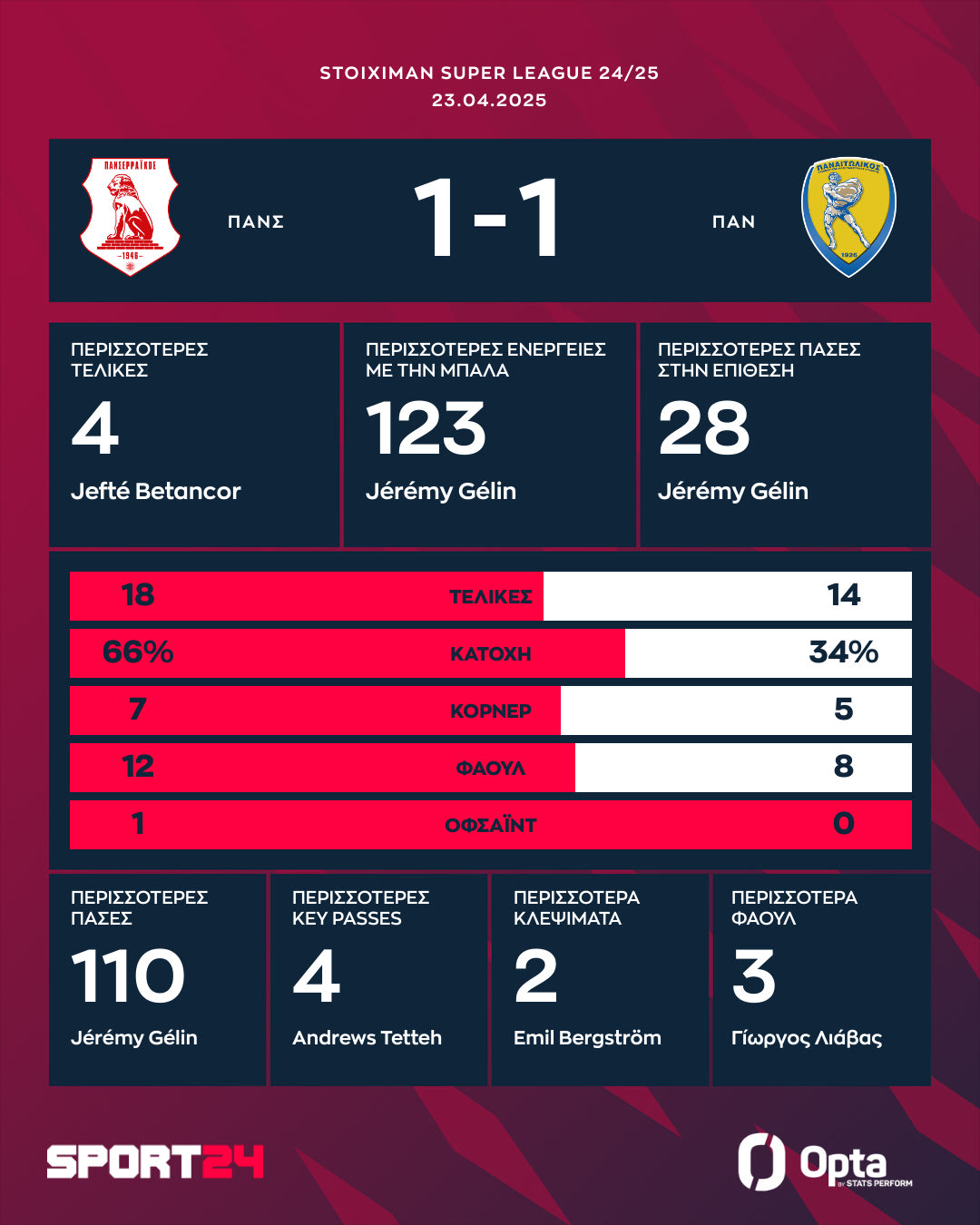 - ΠΑΝΣΕΡΡΑΙΚΟΣ (Φεράντο): Γκουγκεσασβίλι, Δεληγιαννίδης, Βόλνεϊ (74′ Γκαλβάν), Μπέργκστρεμ, Ντάβιντσον, Ομεονγκά (61′ Λιάσος), Στάικος (85′ Ντέλετιτς), Ζελέν, Σαλαζάρ, Φαρές, Μπετανκόρ