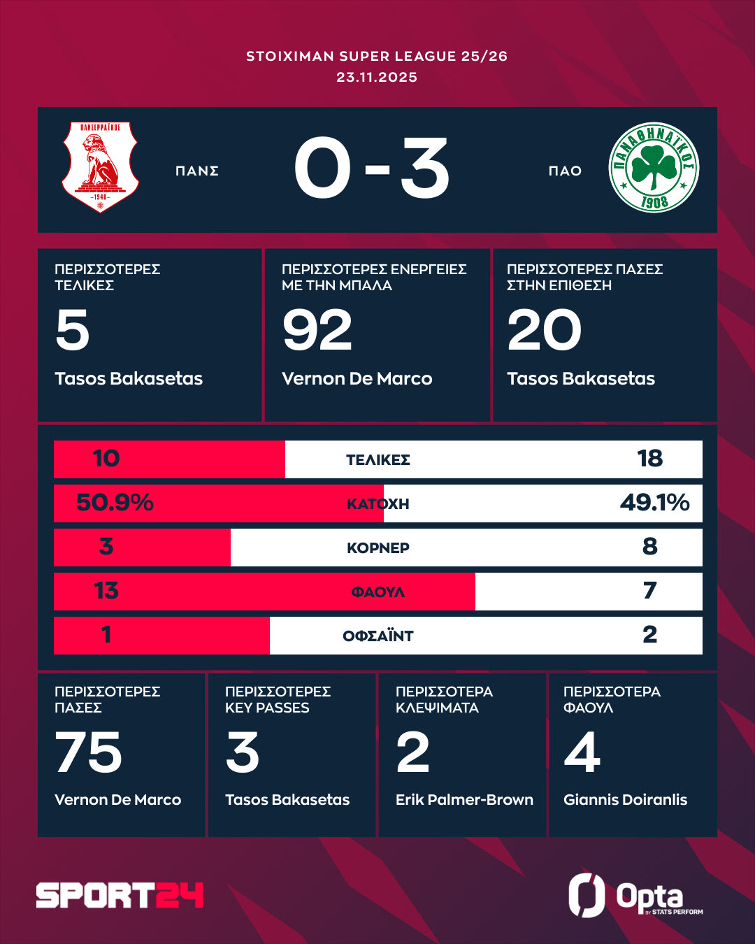 Ο Γέντβαϊ έκανε το 2-0 στο 60′ με το σπάνιας ομορφιάς τέρμα του, ενώ η άψογη συνεργασία μεταξύ Μλαντένοβιτς, Πάντοβιτς και Μπακασέτα, έφερε το τρίτο γκολ για τους φιλοξενούμενους, με τον αρχηγό του τριφυλλιού να διαμορφώνει το τελικό αποτέλεσμα στο 69′.