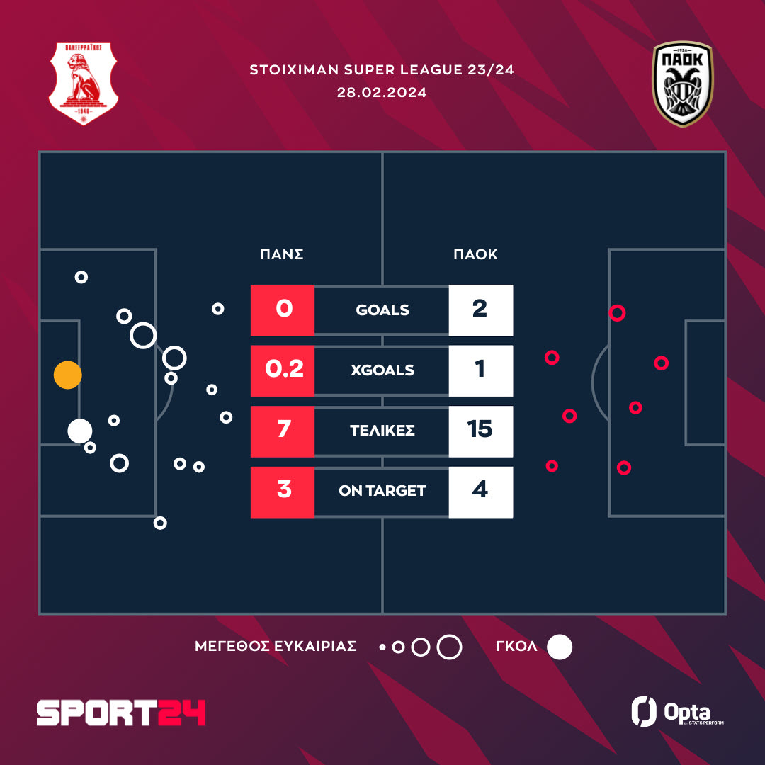 Στο 15′ ήρθε και η πρώτη τελική από τον Πανσερραϊκό. Ο Ουάρντα πήρε την μπάλα στα αριστερά, ντρίμπλαρε ωραία, σούταρε λίγο μέσα στην περιοχή, ωστόσο μπλόκαρε εύκολα ο Ζίβκοβιτς. Η αμέσως επόμενη φάση ήταν του Κωνσταντέλια με πλασέ μέσα από το “κουτί” το οποίο πέρασε λίγο έξω.