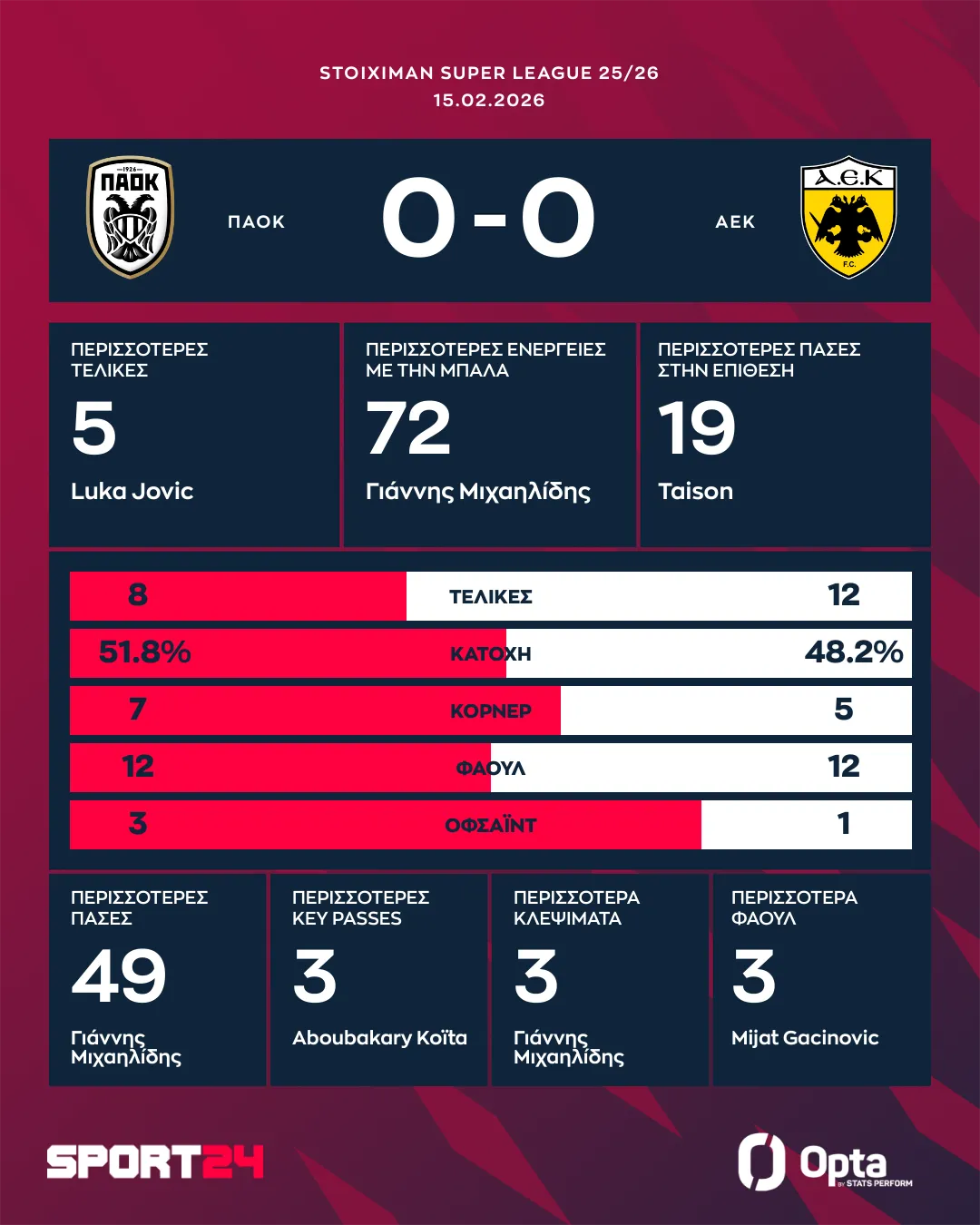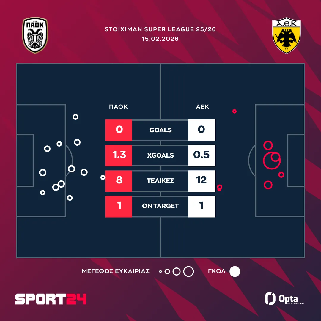 Το ντέρμπι των Δικεφάλων δεν είχε νικητή και γκολ και η μάχη της κορυφής συνεχίζεται. Ο Στρακόσα έπιασε πέναλτι του Γιακουμάκη στο 12′, ενώ η ΑΕΚ είχε δύο δοκάρια με τον Κοϊτά και τον Γιόβιτς στο 40′ και στο 90+3′.