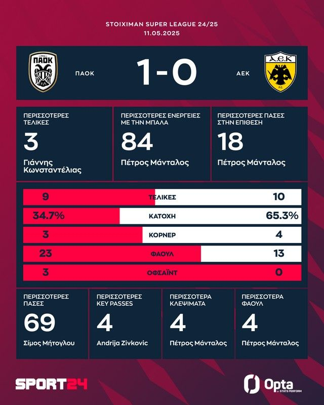 Από την άλλη μεριά η ΑΕΚ γνώρισε την έκτη ήττα της σε έξι παιχνίδια στα playoffs, ολοκλήρωσε το πρωτάθλημα με μία ισοπαλία και επτά ήττες στις 8 τελευταίες αγωνιστικές και τερμάτισε στην τέταρτη θέση με 53 βαθμούς. Έτσι οι “κιτρινόμαυροι” θα παίξουν στον 2ο προκριματικό γύρο του Conference League.